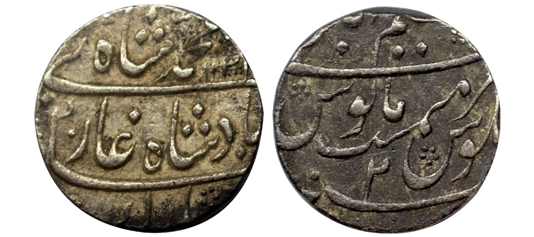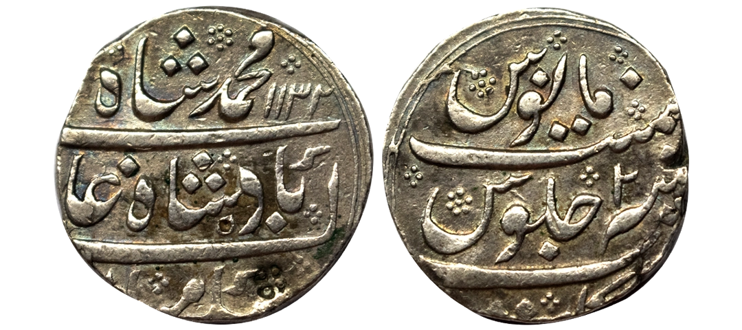 Muhammad Shah, Rupee, Akhtarnagar Awadh Mint, complete Mint name in the top line on rev, AH 1136, RY 6, Sikka Mubarak type. Test Marks, Very Fine+, Rare.
