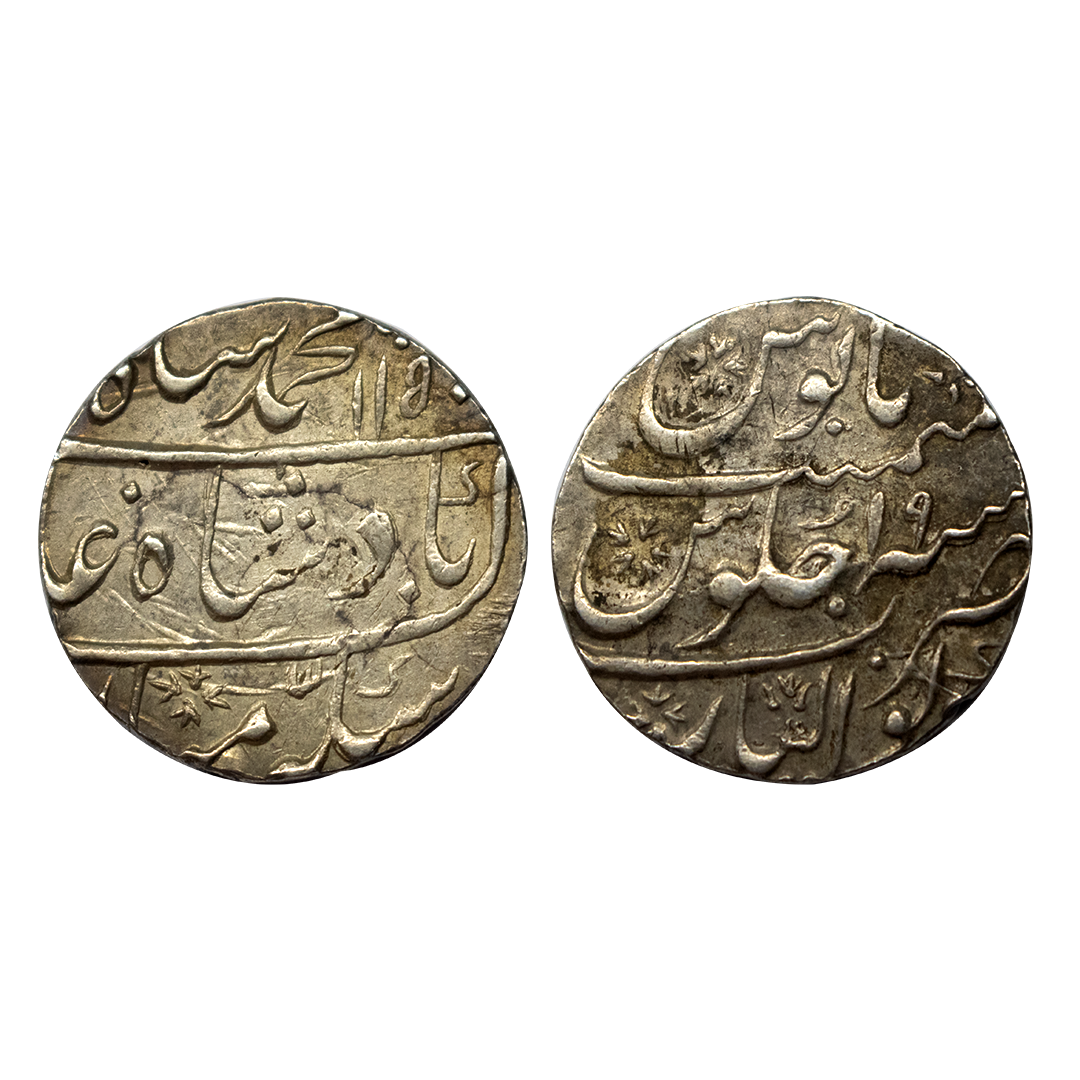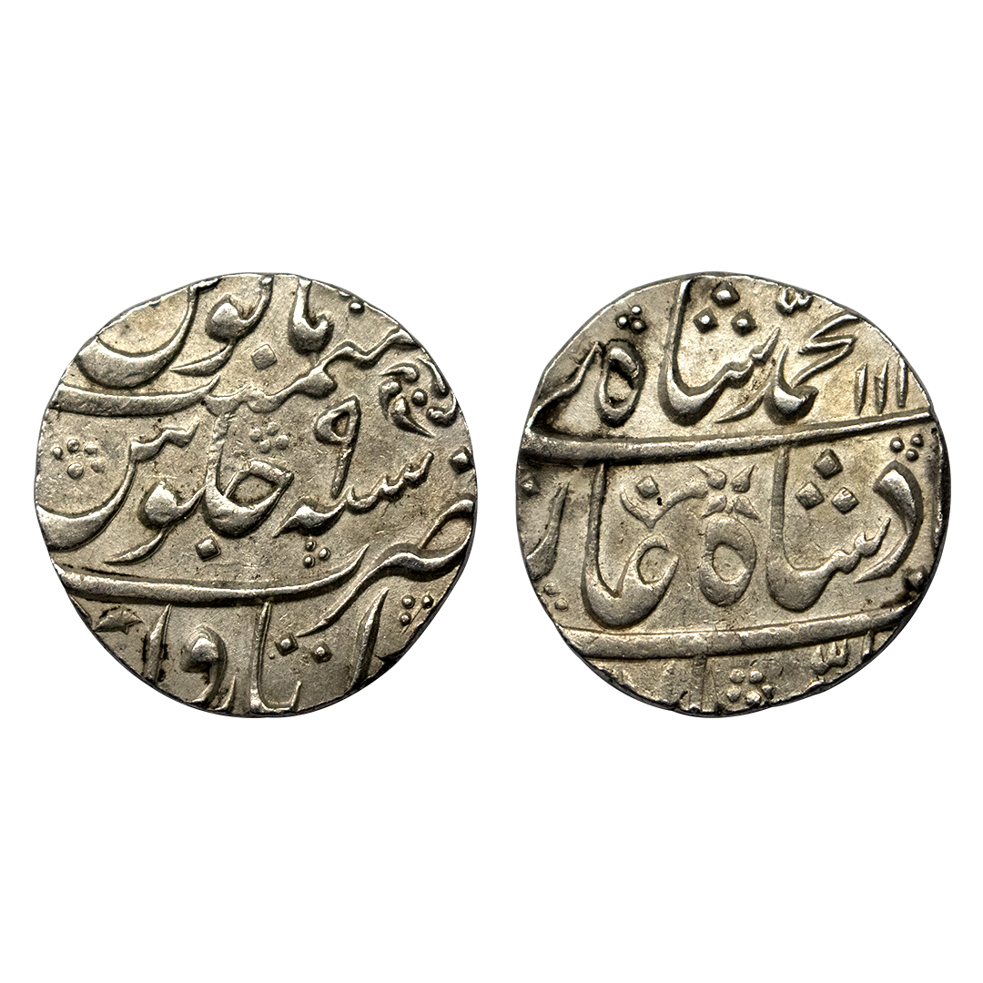 Muhammad Shah, Rupee, Chinapatan Mint, complete Mint name in the bottom line on rev, RY 7, Star Mint Mark on rev, Sikka Mubarak type. No Test Marks, Extremely Fine+ with toning.