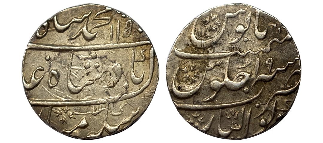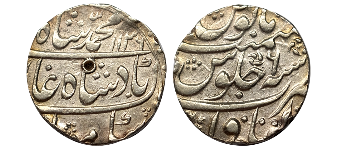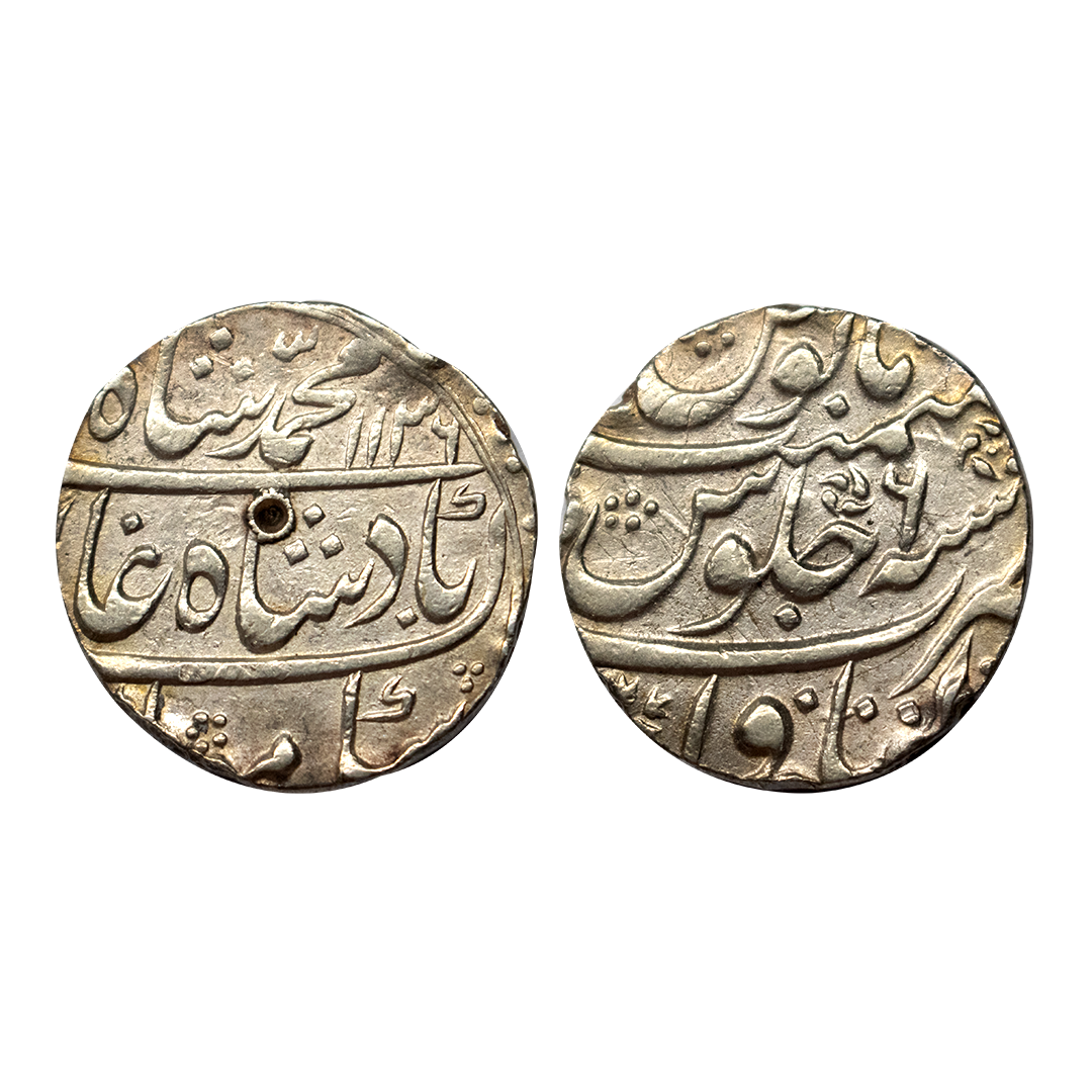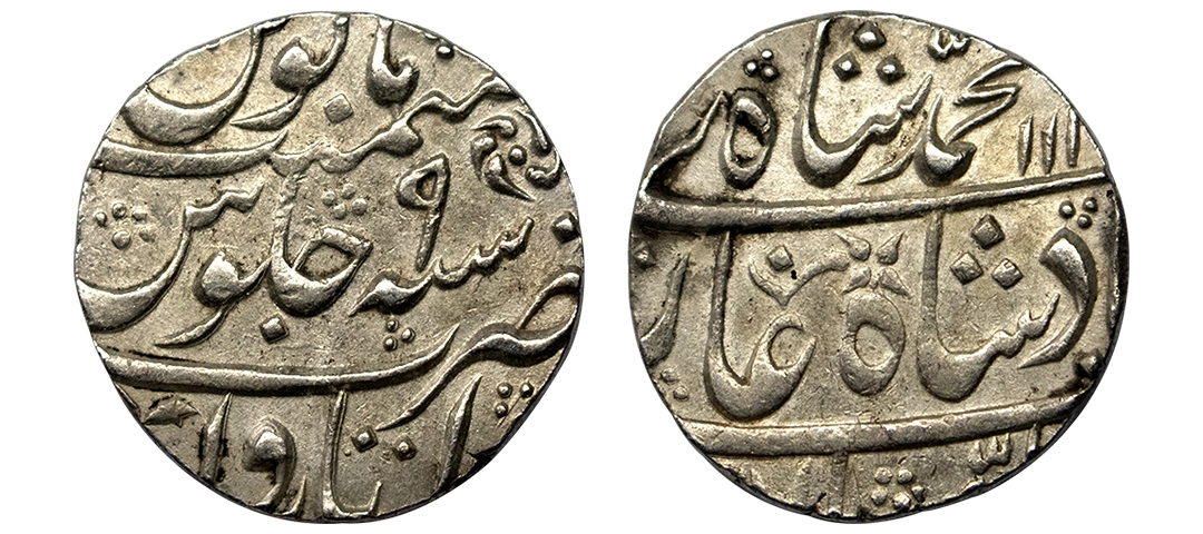 Muhammad Shah, Rupee, Gwalior Mint, complete Mint name in the bottom line on rev, AH 1144, RY 14, Sikka Mubarak type. Test Marks, Extremely Fine+ with toning.