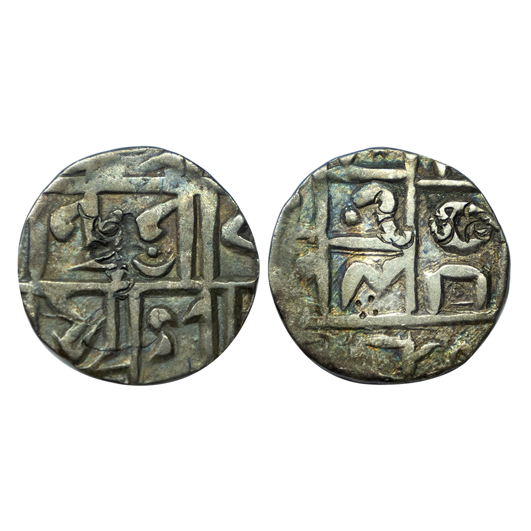 Cooch Behar, Upendra Narayan ( SE 1637-1686/1715-1764 AD), Silver ½ Tanka, Obv: nagari legend in four lines part of sri sri/siva charana/kamala madhu/karasya, Rev: nagari legend part of sri srima/upendra nara/yanasya sake, S.K.Bose # H-1.3, very fine, scarce.