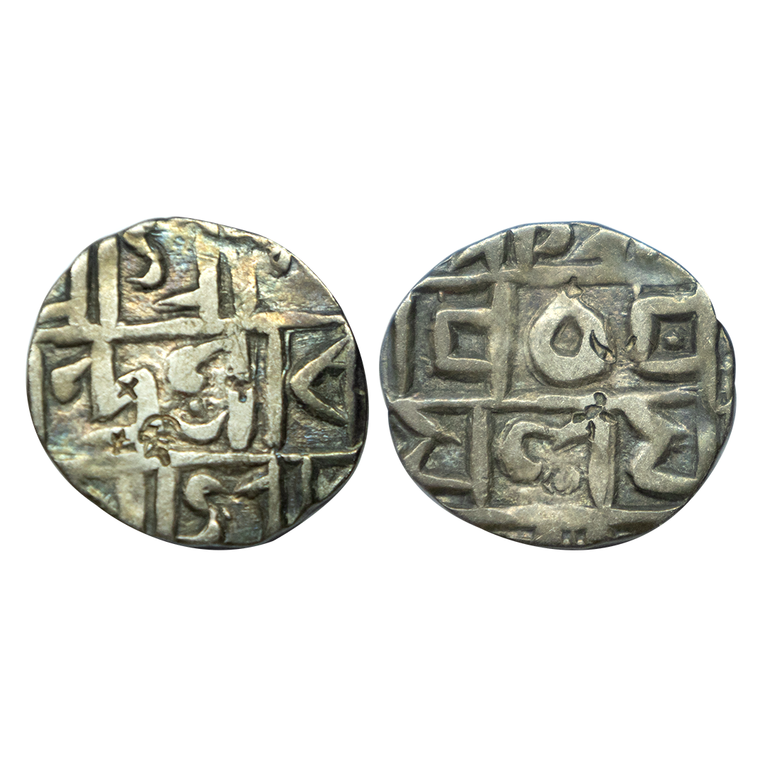 Cooch Behar, Upendra Narayan ( SE 1637-1686/1715-1764 AD), Silver ½ Tanka, Obv: nagari legend in four lines part of sri sri/siva charana/kamala madhu/karasya, Rev: nagari legend part of sri srima/upendra nara/yanasya sake, S.K.Bose # H-1.3, very fine, scarce.