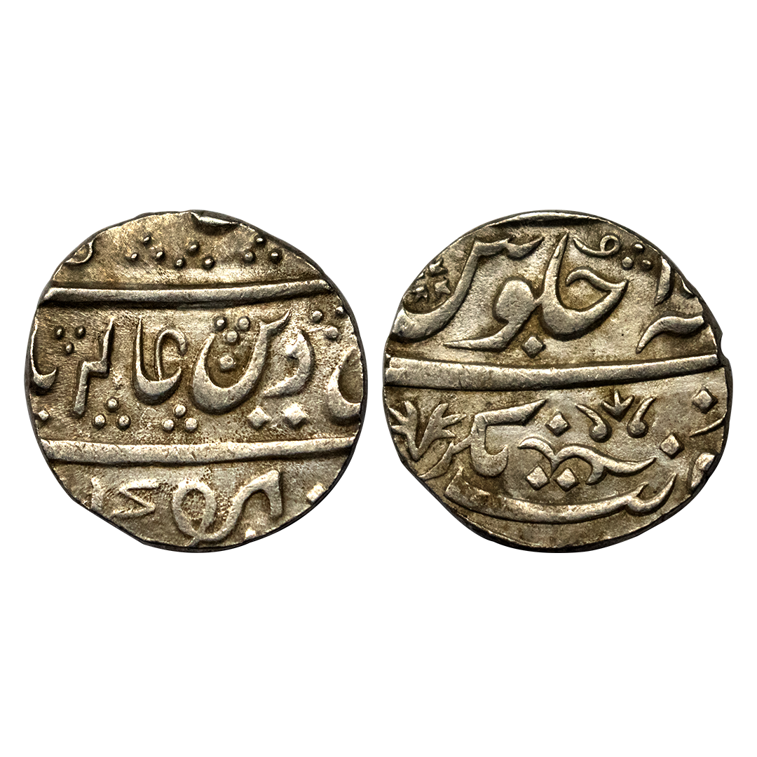 Jaintiapur, Bargosain II (1731-1770 AD), Silver Tanka, 9.21g, SE 1653, obv. Sri Sri Si/va Charana ka/mala Madhu Ka/rasya [star], pistol in left margin, sword to right, rev. Sri Sri Ja/yantipura Pu/randarasya Sa/ke 1653, About Very Fine.