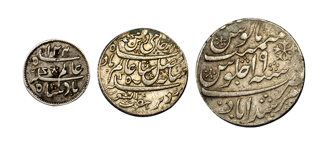 Bengal Presidency, Murshidabad Mint, set of 3, Silver Rupee, ½ & ¼, in the name of Shah Alam II, RY 19, oblique milling (Prid 157, 158 & 159). Very Fine+, scratches on the Rupee. (3)