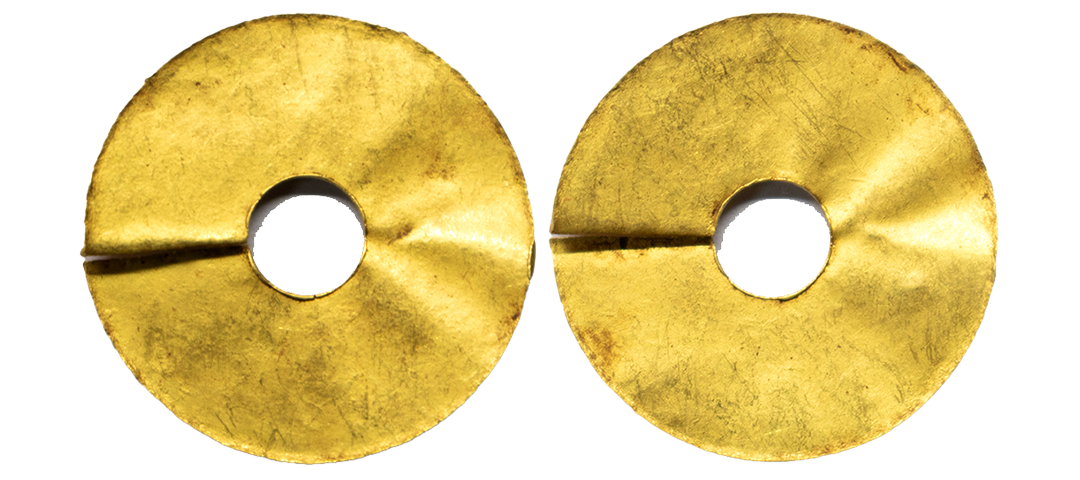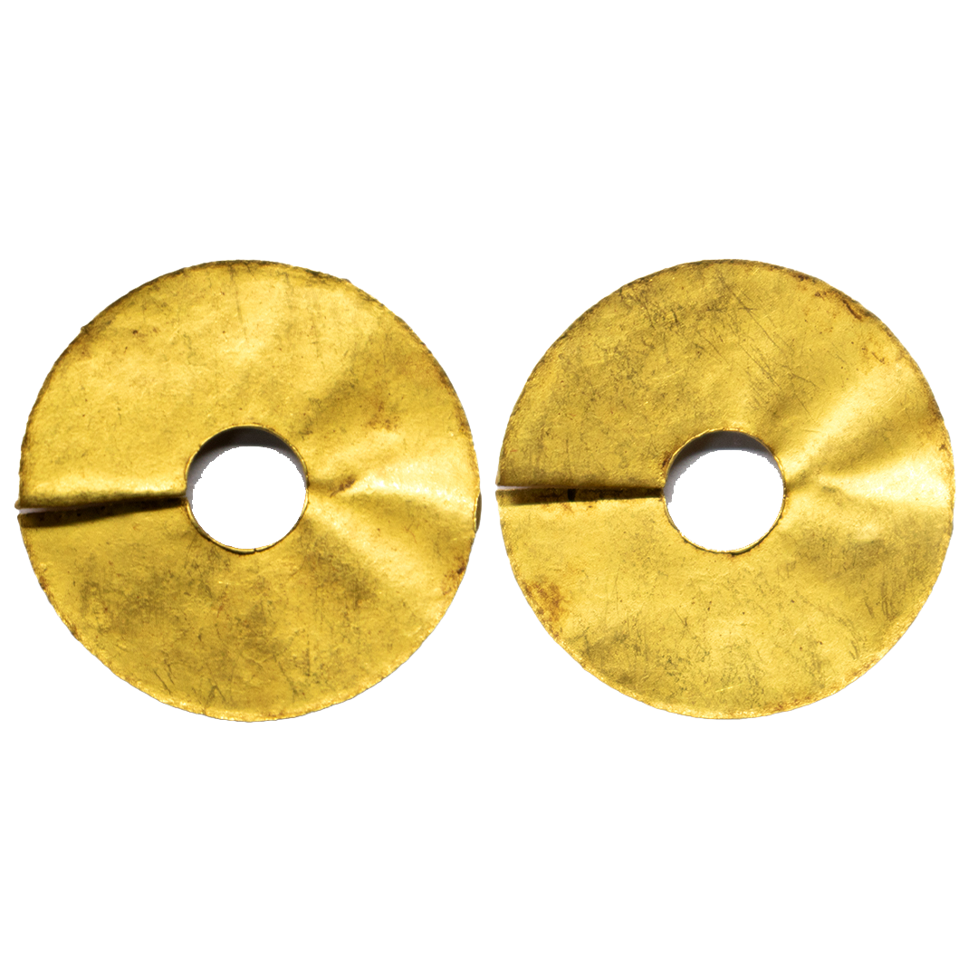 Indus Valley Civilization (mature phase, 2500 - 2000 BC), gold ornamental diskette, to be strung into a necklace, said to have been recovered as a surface find at Lothal, Gujarat. 2.11g. 30.79mm.Extremely fine, Extremely rare.A large hoard of such diskettes was found in May 2000 at Mandi in Muzaffarnagar district, Western Uttar Pradesh. The hoard was contained in two bronze containers and included many varieties of spacer beads, hollow terminal beads, single and double bell-shaped beads, and thin circular diskettes, similar to this one. However, this diskette is reportedly found at Lothal and if so, this would be the first ever object of its kind to be found at IVC sites in Western India. It has been fashioned with a rim and two very small holes with a neat cleft in on the radius. The technique and method of its manufacture are a testament to the skills and metallurgical knowledge of the Indus Valley Civilization.