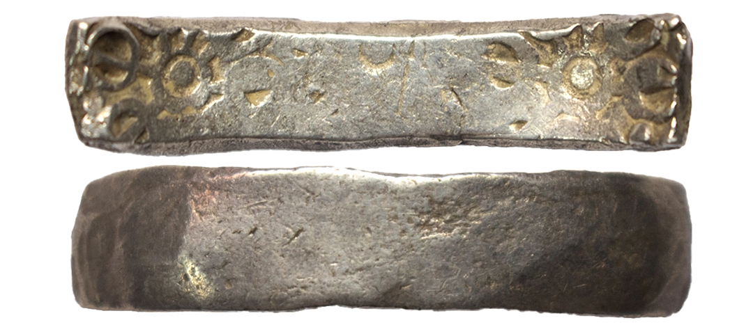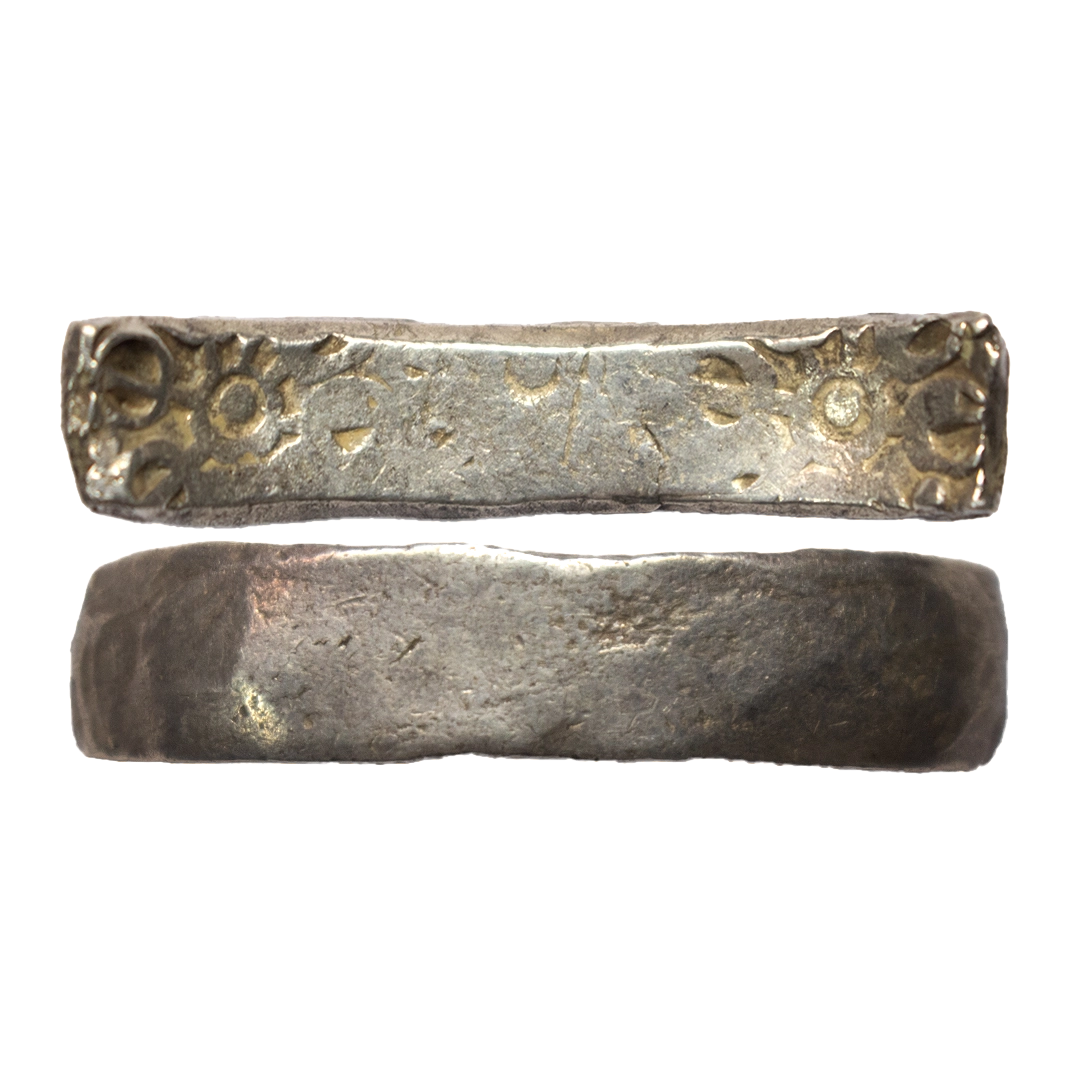 Archaic Coinage, Punch Marked, attributed to Gandhara Mahajanapada, Kabul Region (Afghanistan), Bent Bar, Silver Shatamana, 11.30Grms, OBV: Six armed symbol at each end of the bar, Uniface, long bar variety. (Rajgor # Series 34). Fine+.
