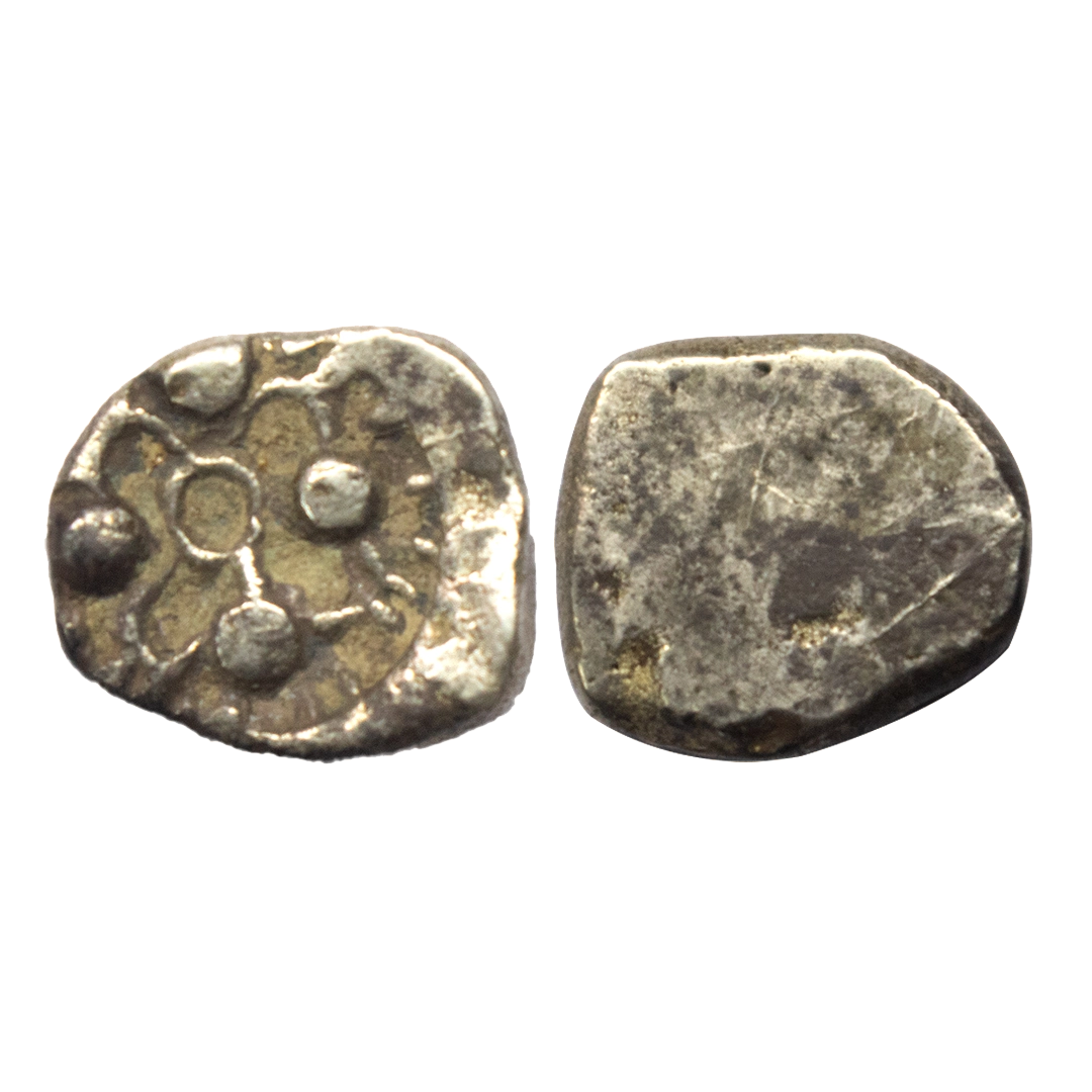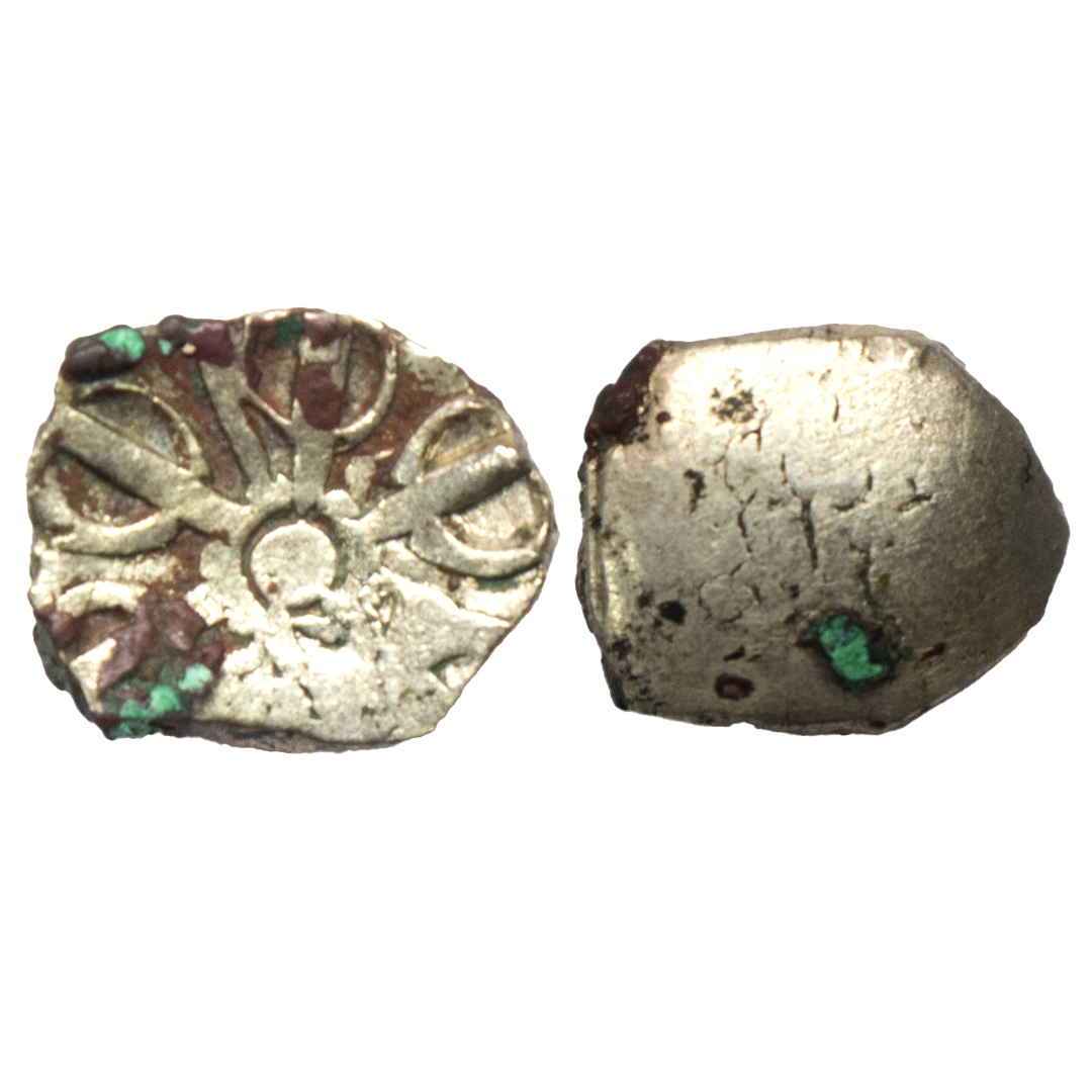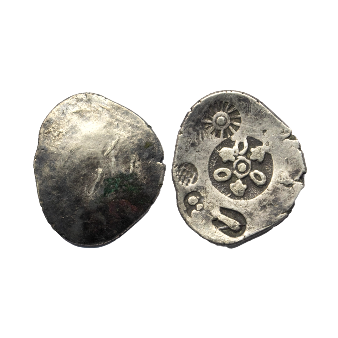 Archaic silver punch-marked coin - Bihar series, generally attributed to 'Magadha Janapada' of pre-imperial period, (c.450-400 BC), struck to Vimshatika standard, similar Rajgor Series 0, 4.77g. Obv: Three punches - 1. Sun, 2. Six-armed symbol (in centre), 3. Large dot with six small dots above; plus three small banker's marks. Rev: plain.About extremely fine, Very rare.
