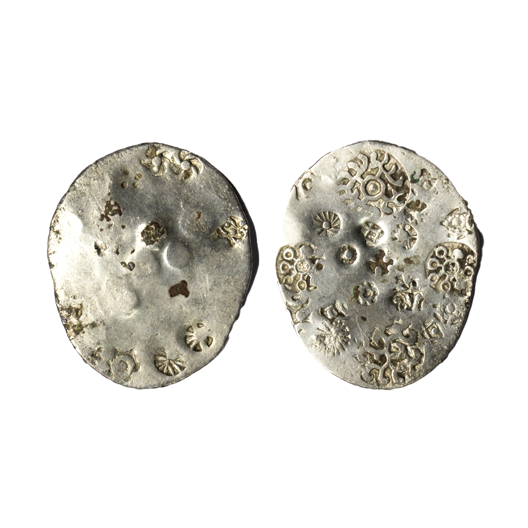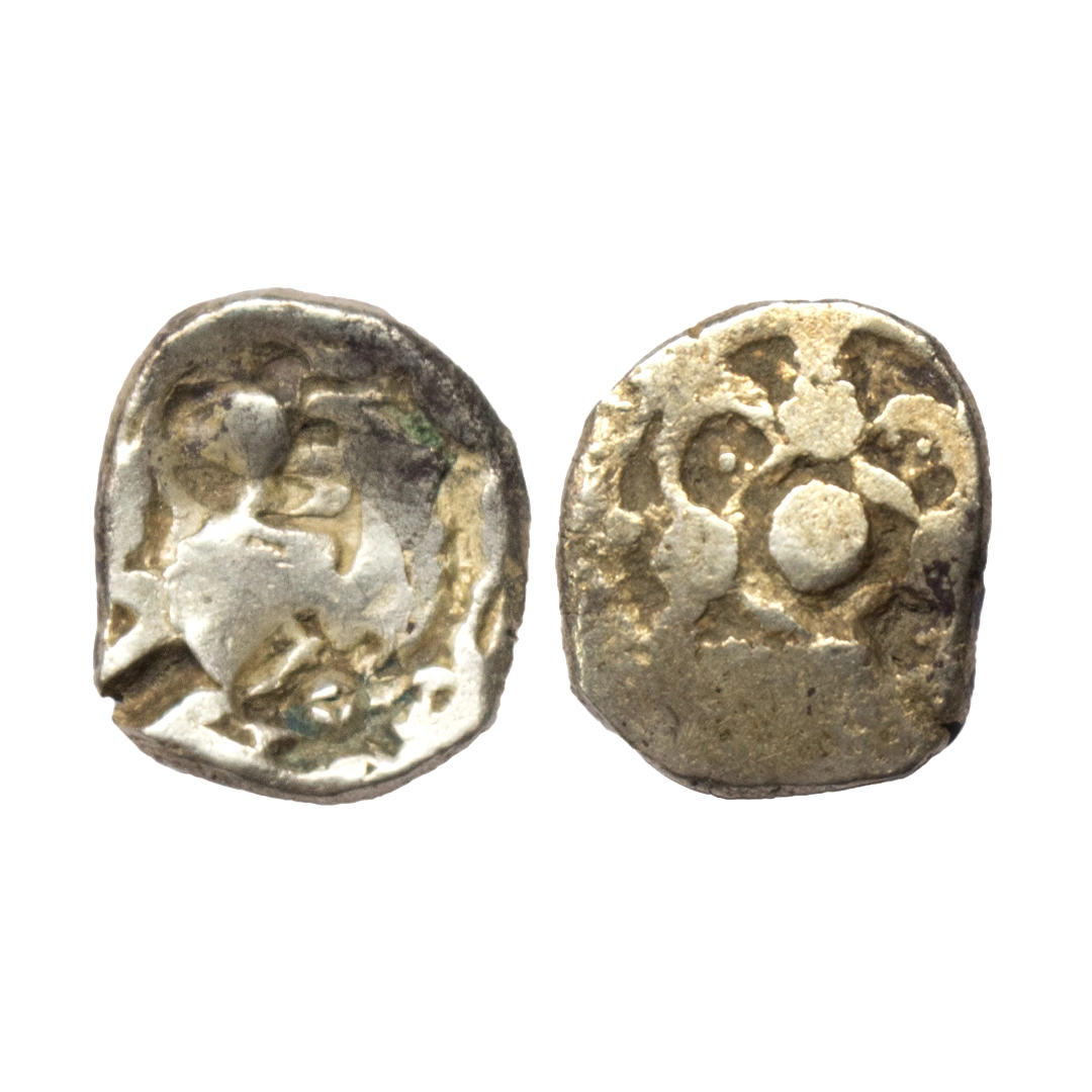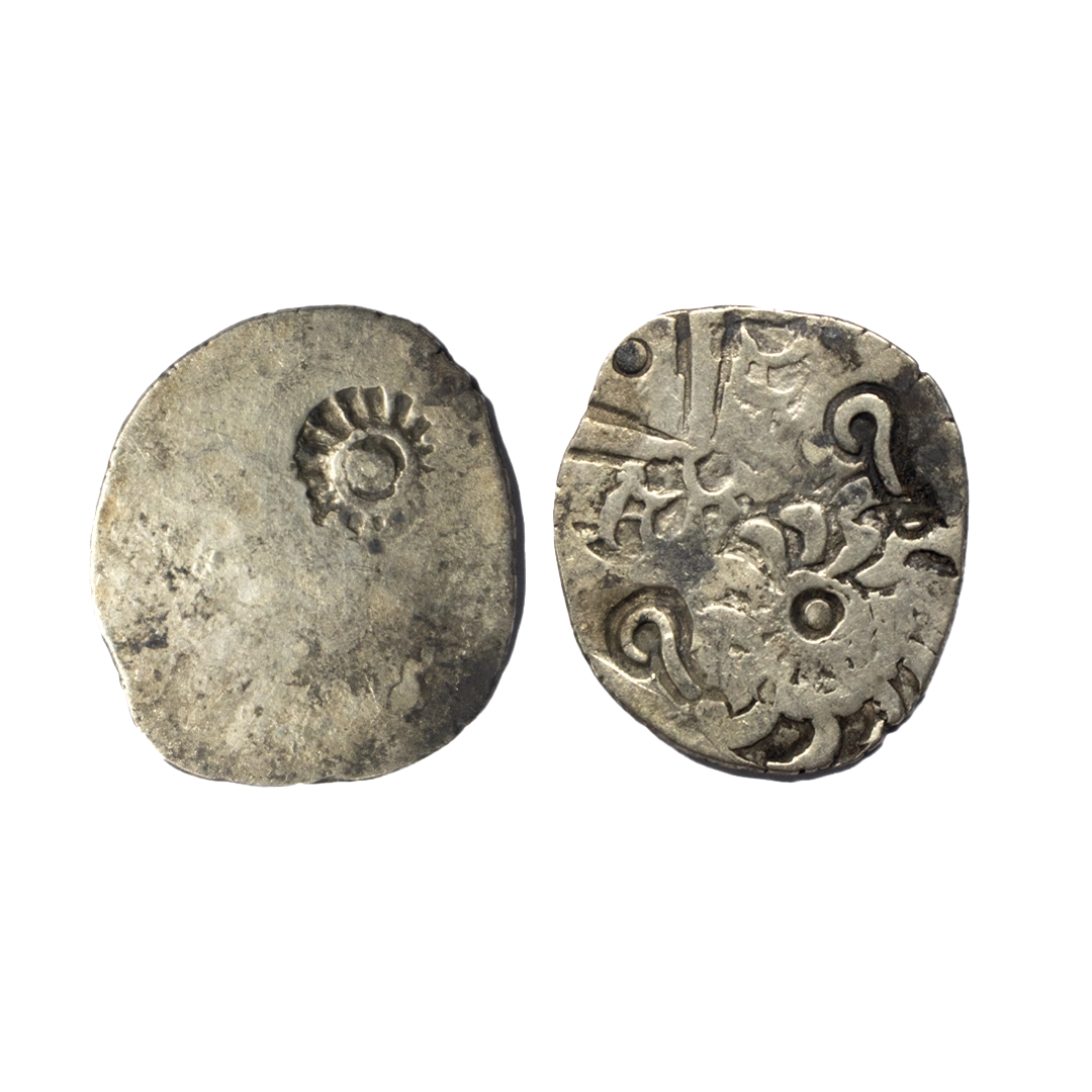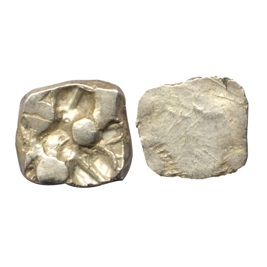 Archaic silver punch-marked coin - Bihar series, generally attributed to 'Magadha Janapada' of pre-imperial period, (c.450-400 BC), struck to Vimshatika standard, similar Rajgor Series 0, 4.77g. Obv: Three punches - 1. Sun, 2. Six-armed symbol (in centre), 3. Large dot with six small dots above; plus three small banker's marks. Rev: plain.About extremely fine, Very rare.