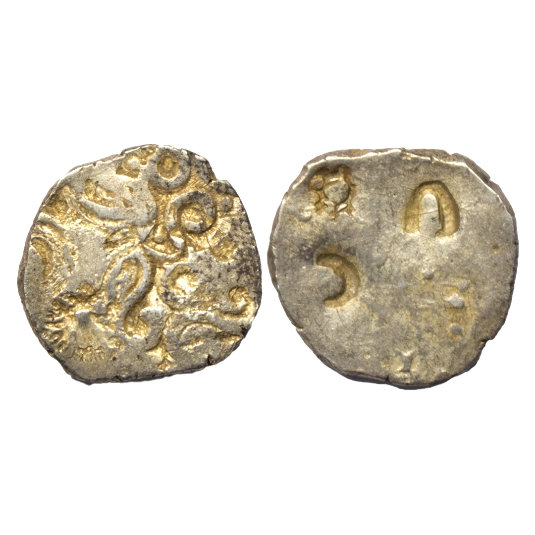 Archaic Coinage, Punch Marked, Kosala Janapada, Silver Karshapana, 2.60Grms, ABCD type, OBV: Sun with moon, English word ‘S’ type symbol and other two geometric symbols, REV: Traces of banker mark. (Rajgor # Series 65). Fine+.