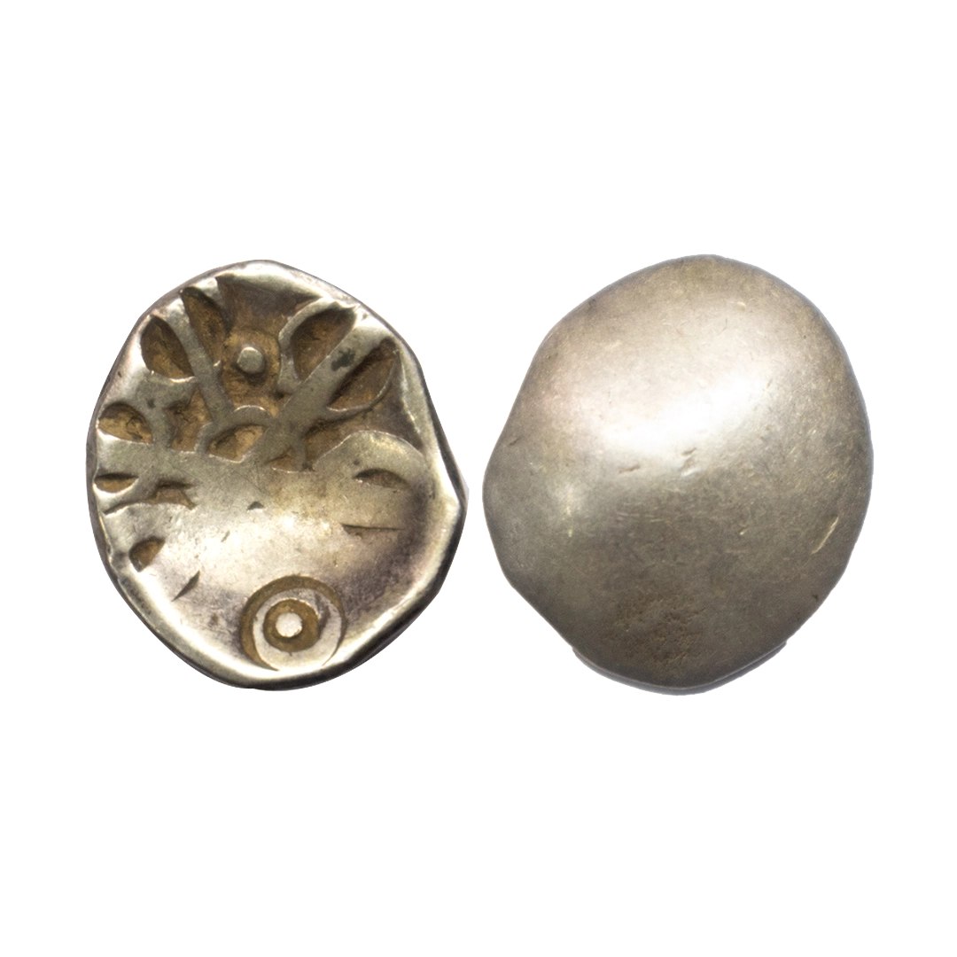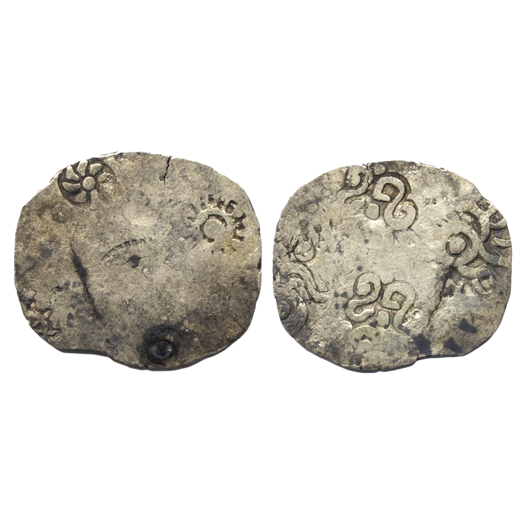 Ancient, Punch Marked Coinage, Kosala Mahajanapada (5th-4th Century BC), Silver Half Vimshatika, 3.28 gms, Obv: Elaborate Flower symbol and other punches, Rev: Multiple Banker’s marks, Hardaker, # Non imperial series, Series 3, KO 47, pg 190, very fine, rare.
