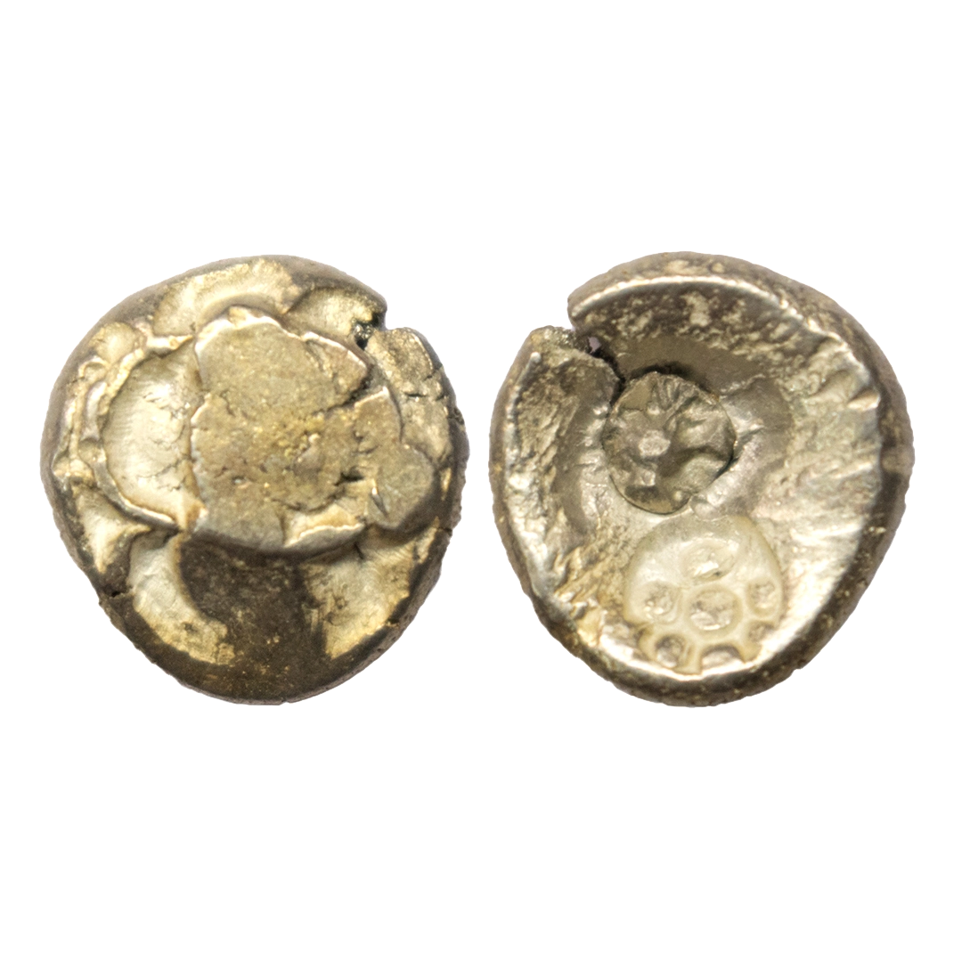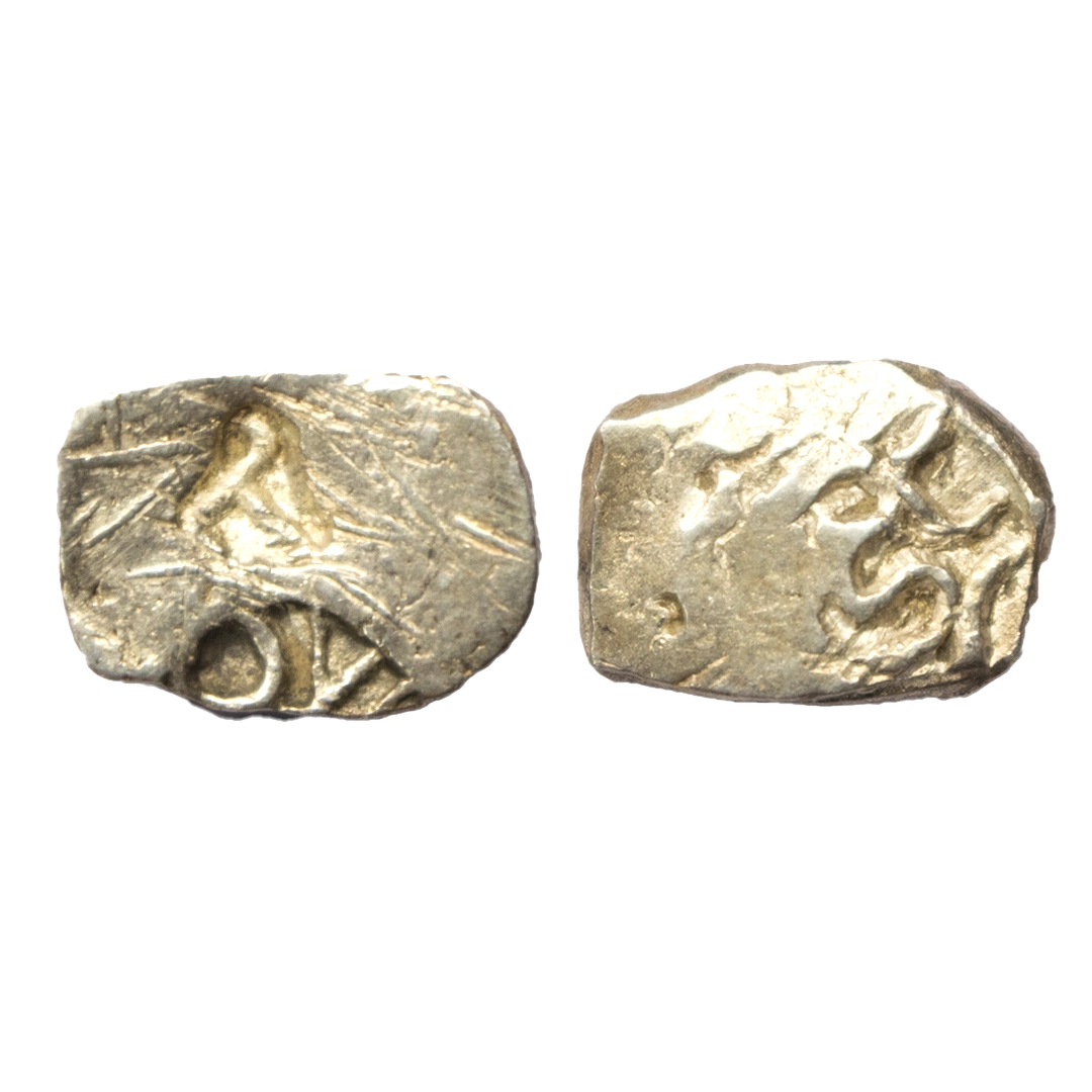 Ancient, Archaic Series, Punch Marked Coinage, attributed to Pauravas of Kaushambi (c. 400-350 BC), Silver 1/2 Karshapana, x.xx gms, this is a single symbol coin, depicting a turtle on obverse and a bankers’ mark on reverse. This series has been attributed to the Pauravas of Kaushambi. As per Puranas, on account of heavy floods in Hastinapur, a line of descendants of Pandavas and Kauravas (what was left of them after the famous Mahabharat war) left Hastinapur and migrated towards Kaushambi around 800 BC and settled there. Present issue is attributed to them. Pauravas were a smaller group of people (not finding mention in the list of 16 janapadas in Anguttara Nikaya) but were in existence during the times of Buddha, on account of which and due to use of an earlier weight standard, these coins are said to have been in circulation till a period when Magadha was spreading its empire but was yet to conquer the central/western parts of modern Uttar Pradesh. Thus the period during which this series might have been in circulation should not have lasted later than 380 BC to 360 BC, Mitchiner # pp.810 - 813 and Hardaker # pp. 109 - 113, very fine+, very rare.