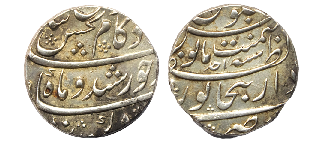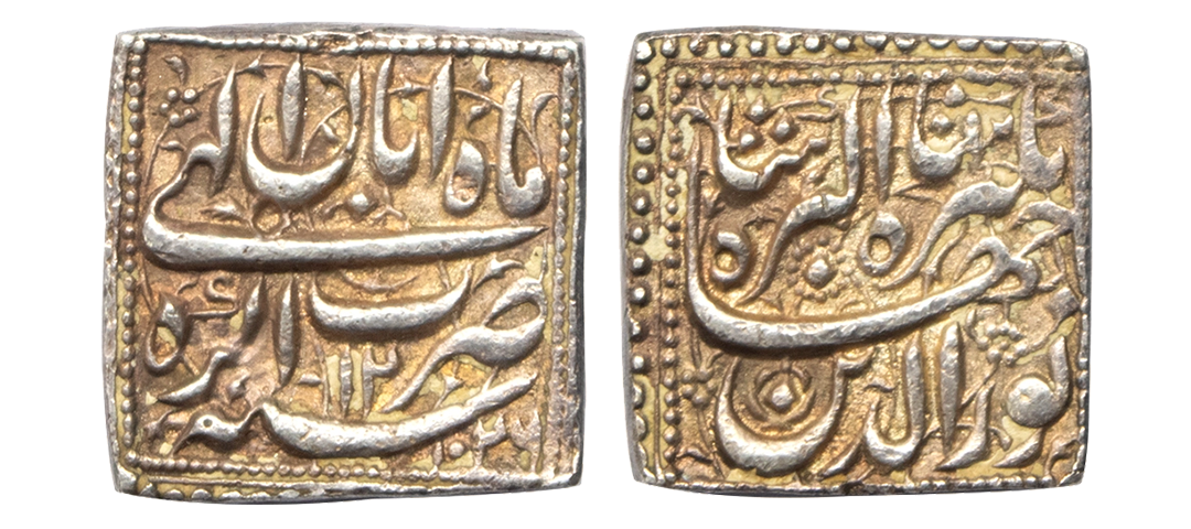 Archaic silver punch-marked coin - Middle Ganga Valley (attributed to 'Kashi Janapada'), c.400-350 BC, Vimshatika standard, scyphate shape and fabric, Rajgor 708, 4.64g. Obv: Four symbols of ABBC configuration - two large 'whorl' marks with anticlockwise sprigs, one large whorl with clockwise sprigs and one whorl without a central circle; many small banker's marks. Rev: a few small banker's marks.Extremely fine, Very rare.