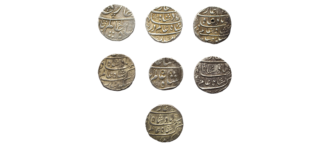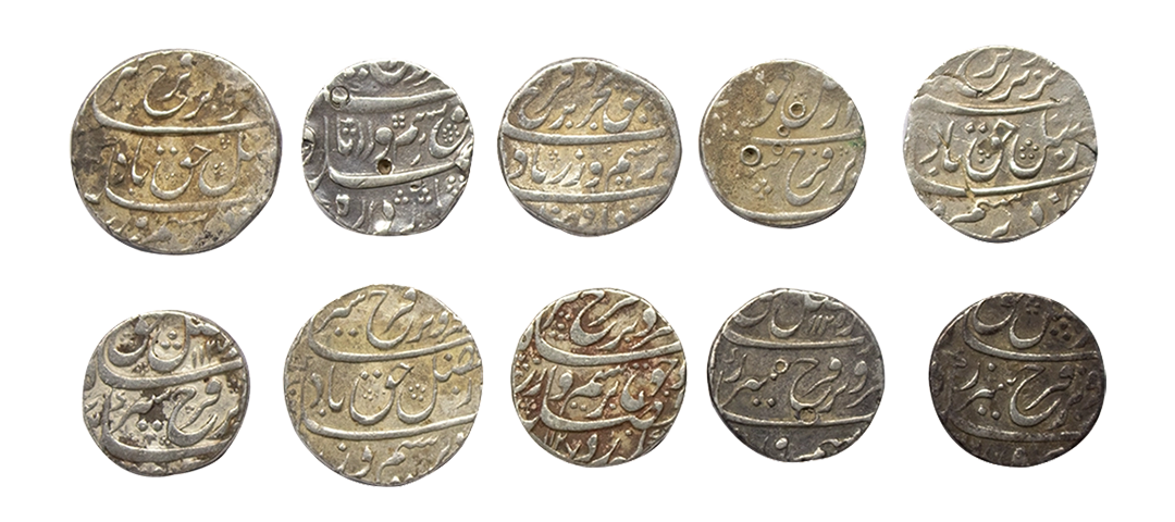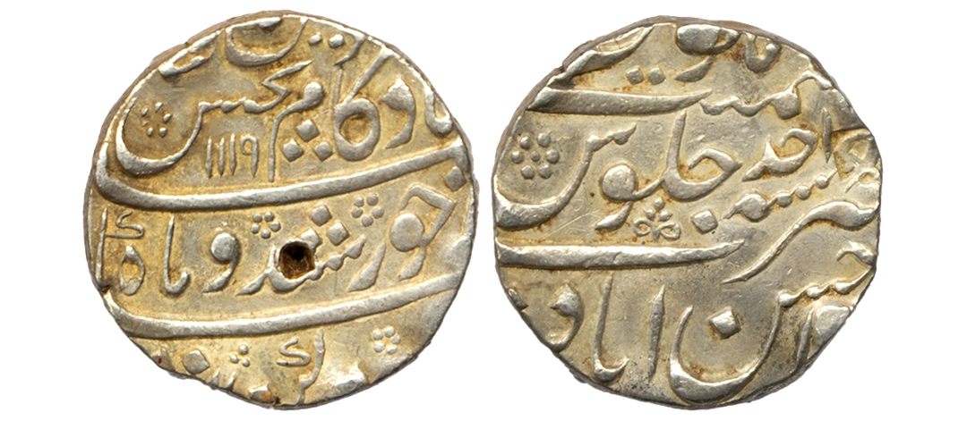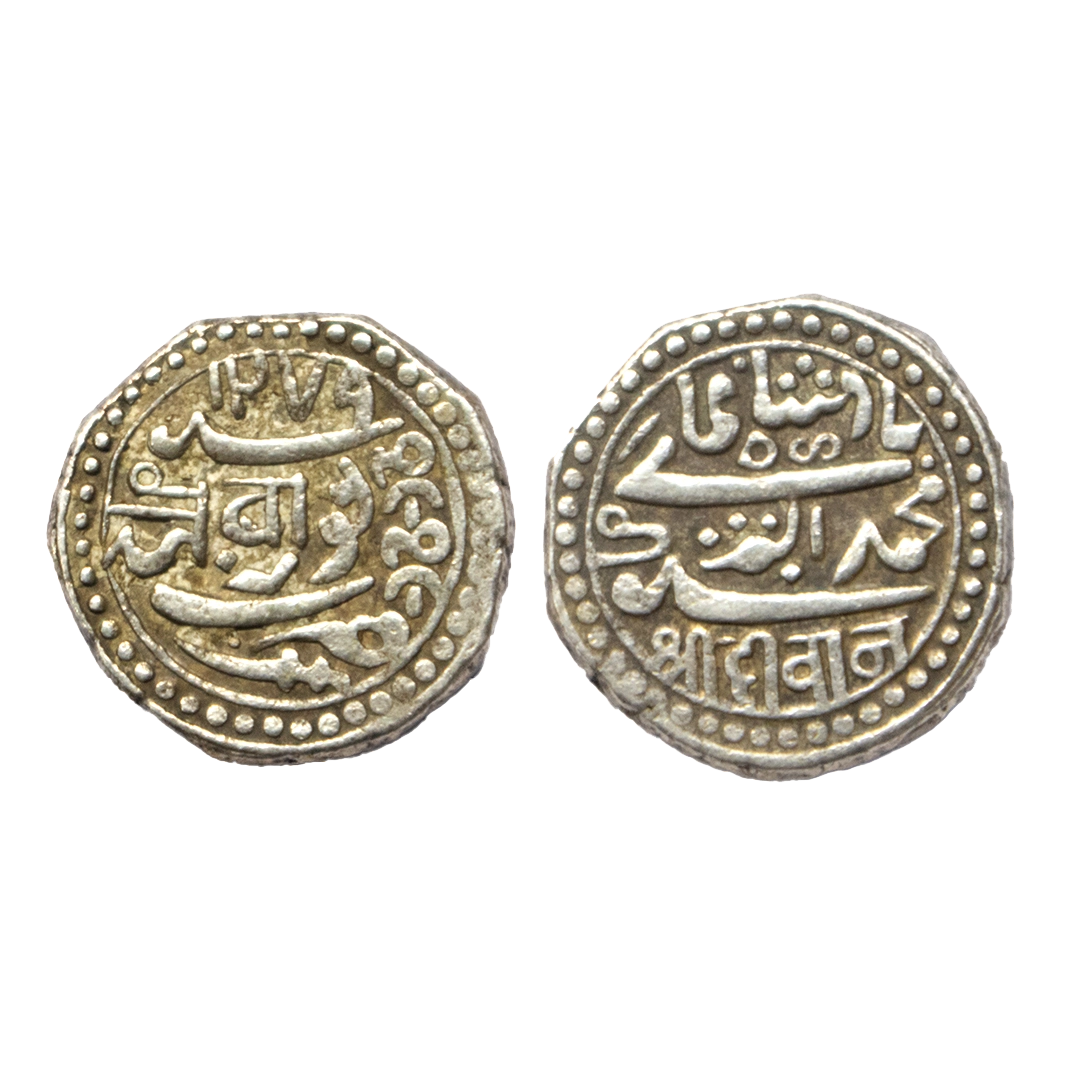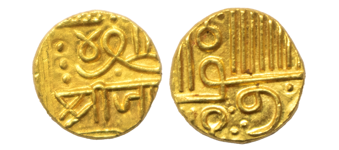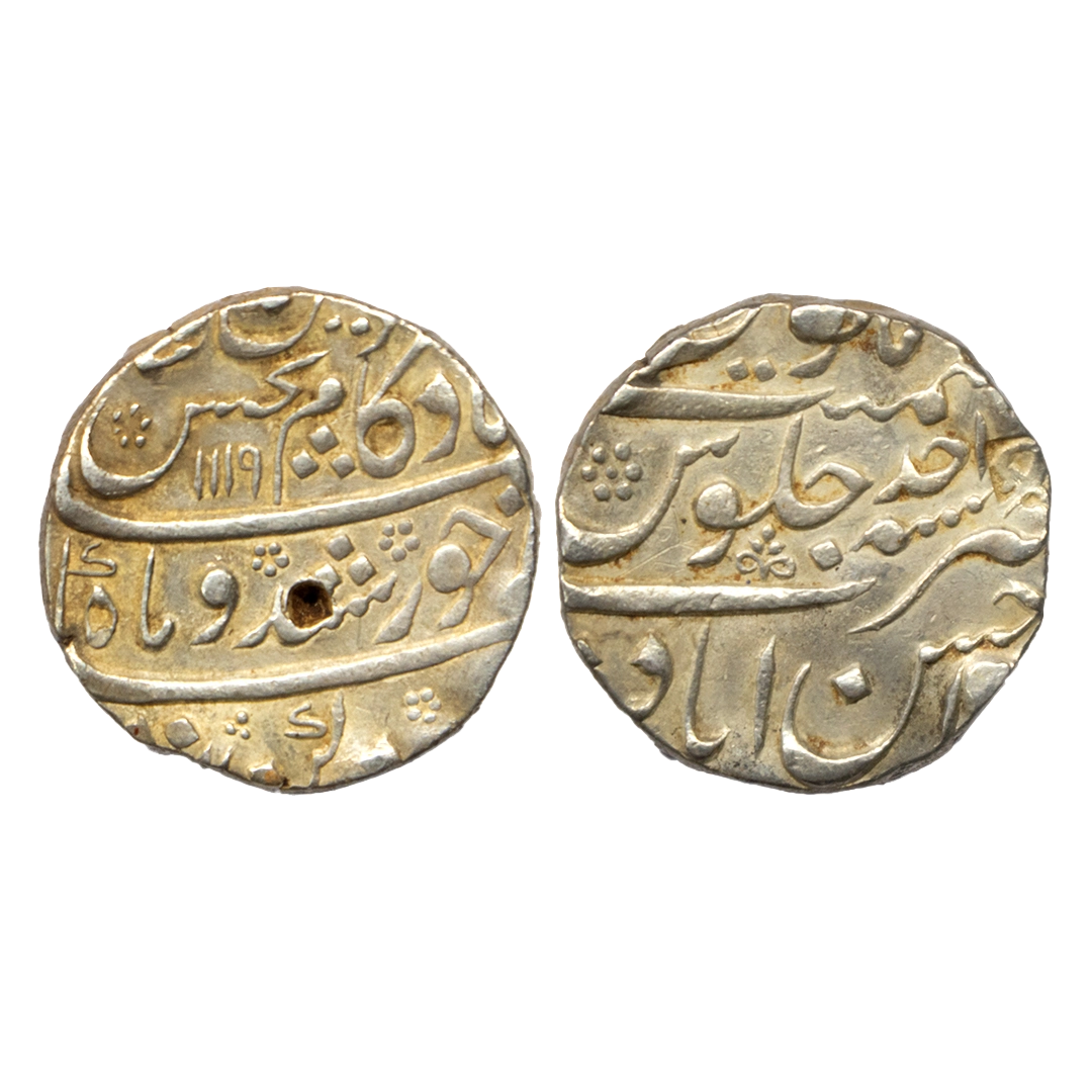Archaic silver punch-marked coin - Bihar series, generally attributed to 'Magadha Janapada' of pre-imperial period, (c.450-400 BC), struck to Vimshatika standard, similar Rajgor Series 0, 4.77g. Obv: Three punches - 1. Sun, 2. Six-armed symbol (in centre), 3. Large dot with six small dots above; plus three small banker's marks. Rev: plain.About extremely fine, Very rare.