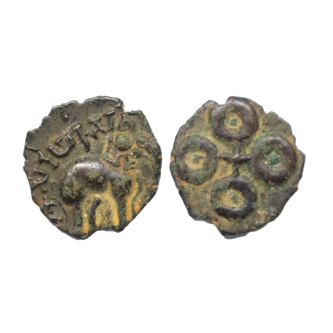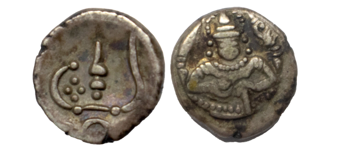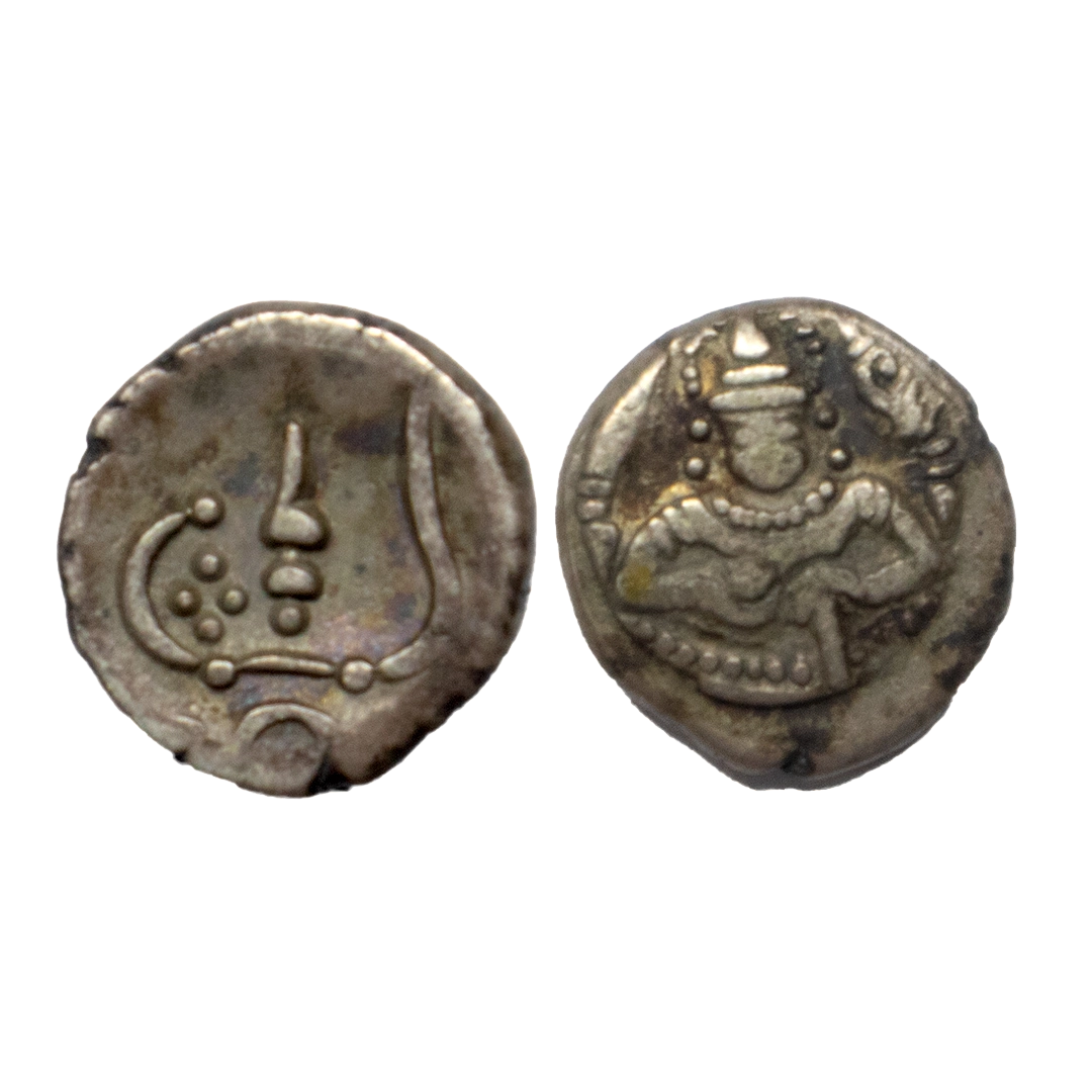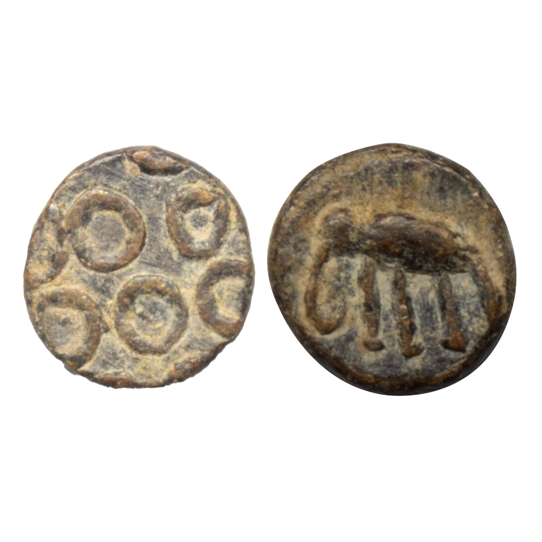 Ancient, Archaic Series, Punch Marked Coinage, attributed to Pauravas of Kaushambi (c. 400-350 BC), Silver 1/2 Karshapana, x.xx gms, this is a single symbol coin, depicting a turtle on obverse and a bankers’ mark on reverse. This series has been attributed to the Pauravas of Kaushambi. As per Puranas, on account of heavy floods in Hastinapur, a line of descendants of Pandavas and Kauravas (what was left of them after the famous Mahabharat war) left Hastinapur and migrated towards Kaushambi around 800 BC and settled there. Present issue is attributed to them. Pauravas were a smaller group of people (not finding mention in the list of 16 janapadas in Anguttara Nikaya) but were in existence during the times of Buddha, on account of which and due to use of an earlier weight standard, these coins are said to have been in circulation till a period when Magadha was spreading its empire but was yet to conquer the central/western parts of modern Uttar Pradesh. Thus the period during which this series might have been in circulation should not have lasted later than 380 BC to 360 BC, Mitchiner # pp.810 - 813 and Hardaker # pp. 109 - 113, very fine+, very rare.