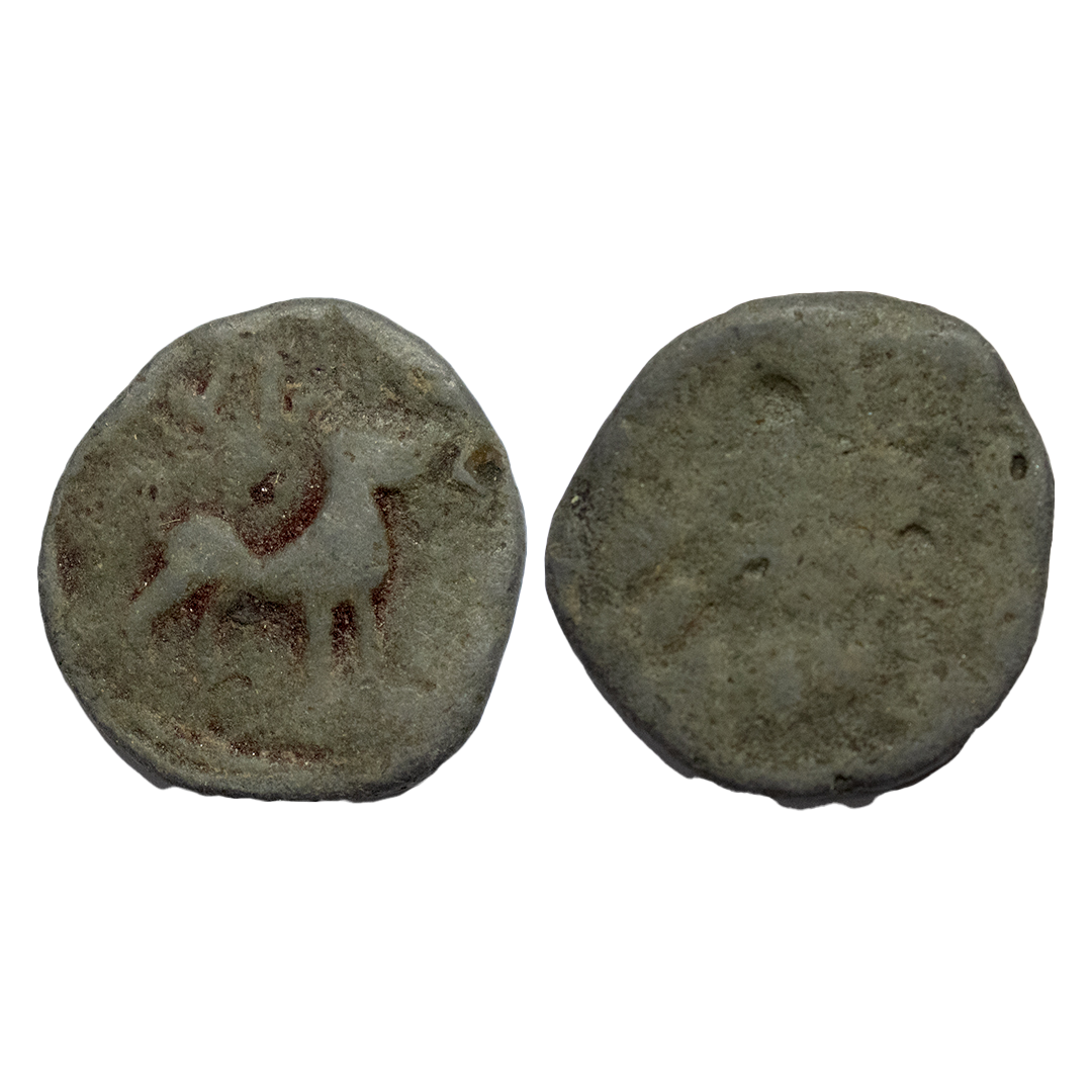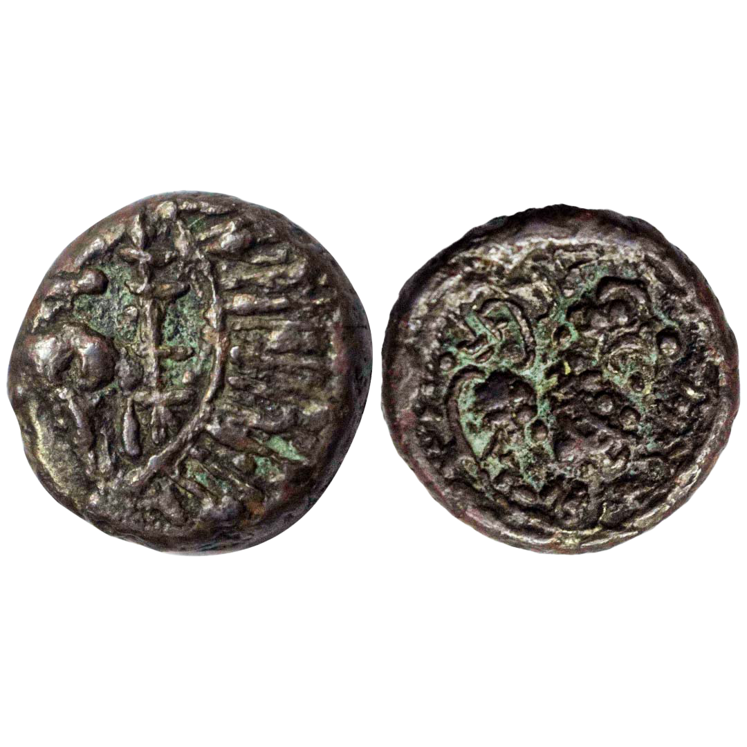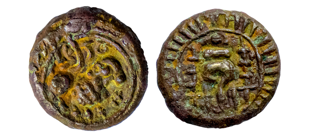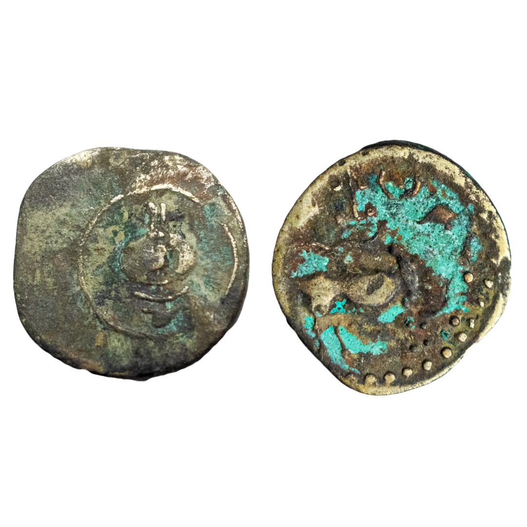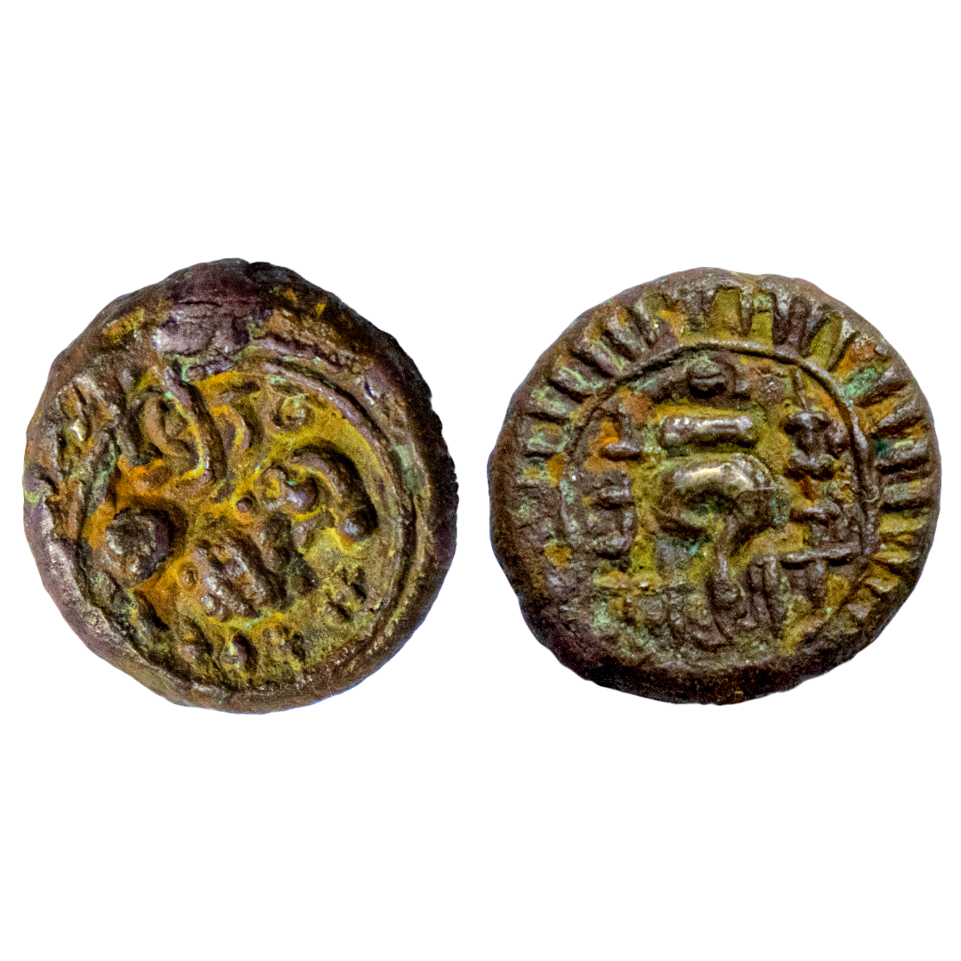 Post-Vakataka, Deccan region, Prithvimaharaja a Kashyapa gotra king (c. 500-600 AD), Vishnukundin type, Copper Alloy Unit, 3.21Grms, OBV: Seated Lion facing right, Brahmi legend above ‘ShriRa(ma)’, All within a circular border, REV: A conch flanked by lamps within rayed circle. (Pieper # 3001). Fine.