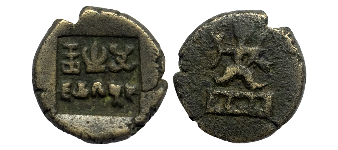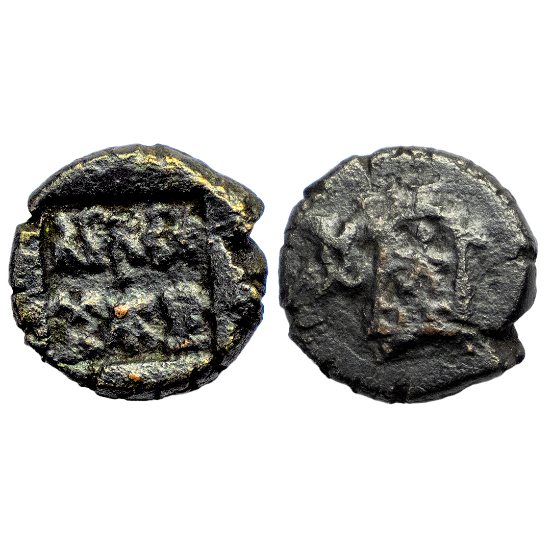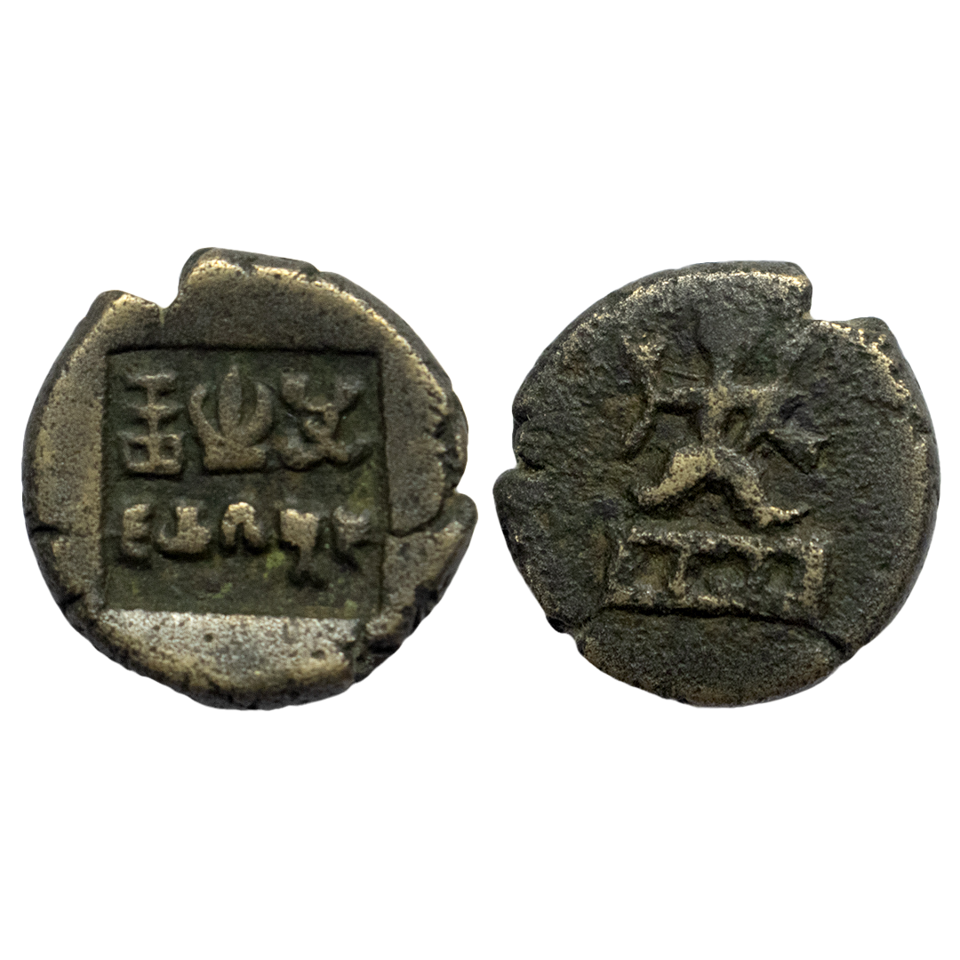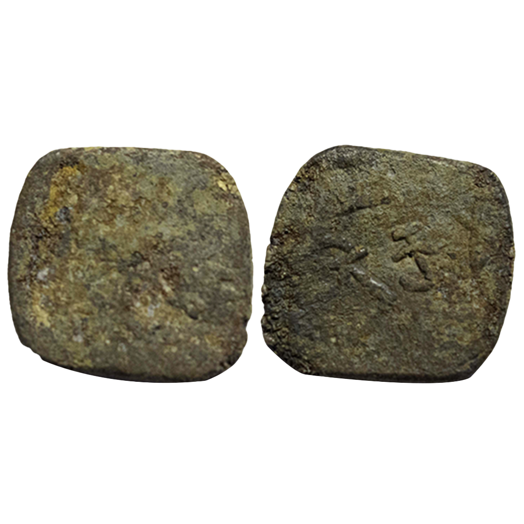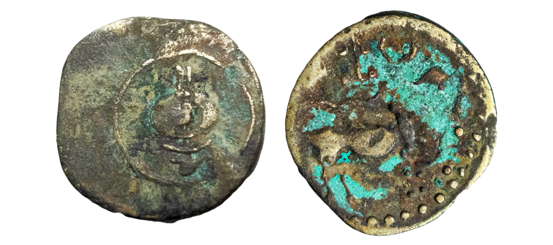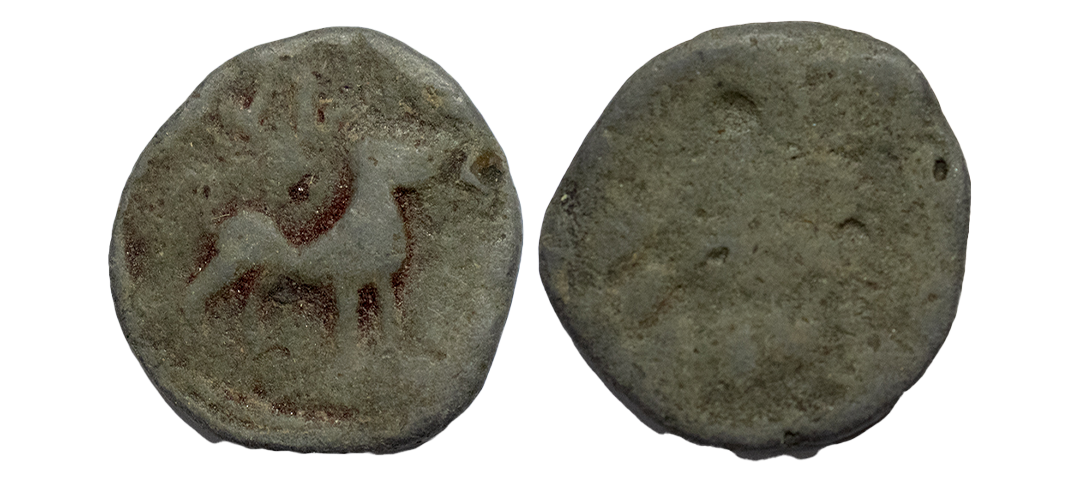 Post-Vakataka, Deccan region, Prithvimaharaja a Kashyapa gotra king (c. 500-600 AD), Vishnukundin type, Copper Alloy Unit, 3.21Grms, OBV: Seated Lion facing right, Brahmi legend above ‘ShriRa(ma)’, All within a circular border, REV: A conch flanked by lamps within rayed circle. (Pieper # 3001). Fine.
