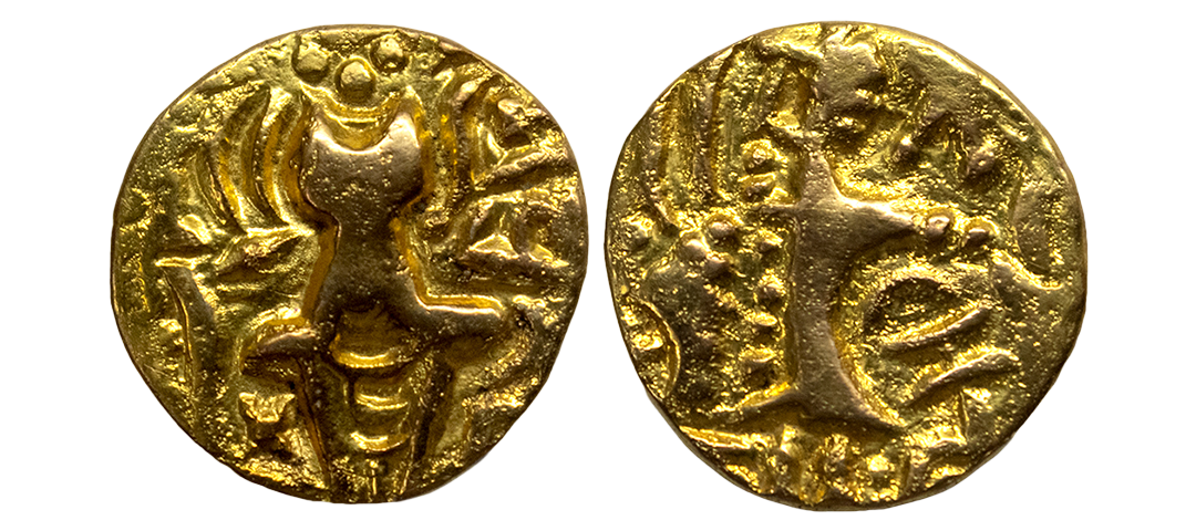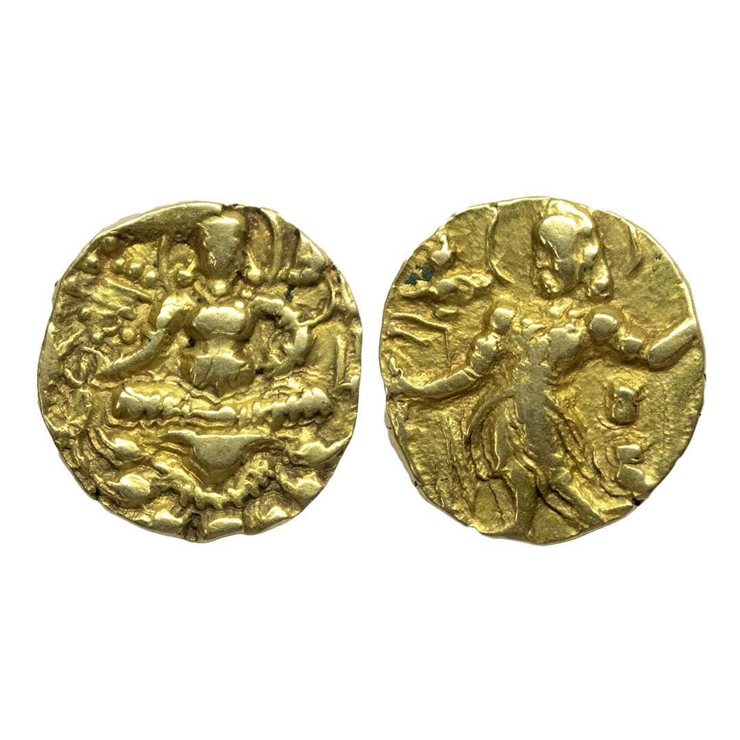 Ancient, Gupta Empire, Chandragupta II (380-415 AD), ‘Horseman’ Type, Gold Dinara, , Obv: King on horseback facing to right, caparisoned horse in prancing position to left, king wearing ear-rings, armlets and necklace, king has large bun behind head without halo, Brahmi legend around starting from 1 O clock ‘Paramabhagava(taoMaharajadhiraja Sri Chandra)guptah’, Rev: Goddess Lakshmi seated in profile on a wicker stool holding a long stemmed flower with leaves and buds in her left hand, right hand is holding a diadem, she is wearing earrings and necklace, tamgha on left field and Brahmi legend ‘Ajitavikramah’ in the right field, Shivlee # Class II, var. A2, very fine, very rare.