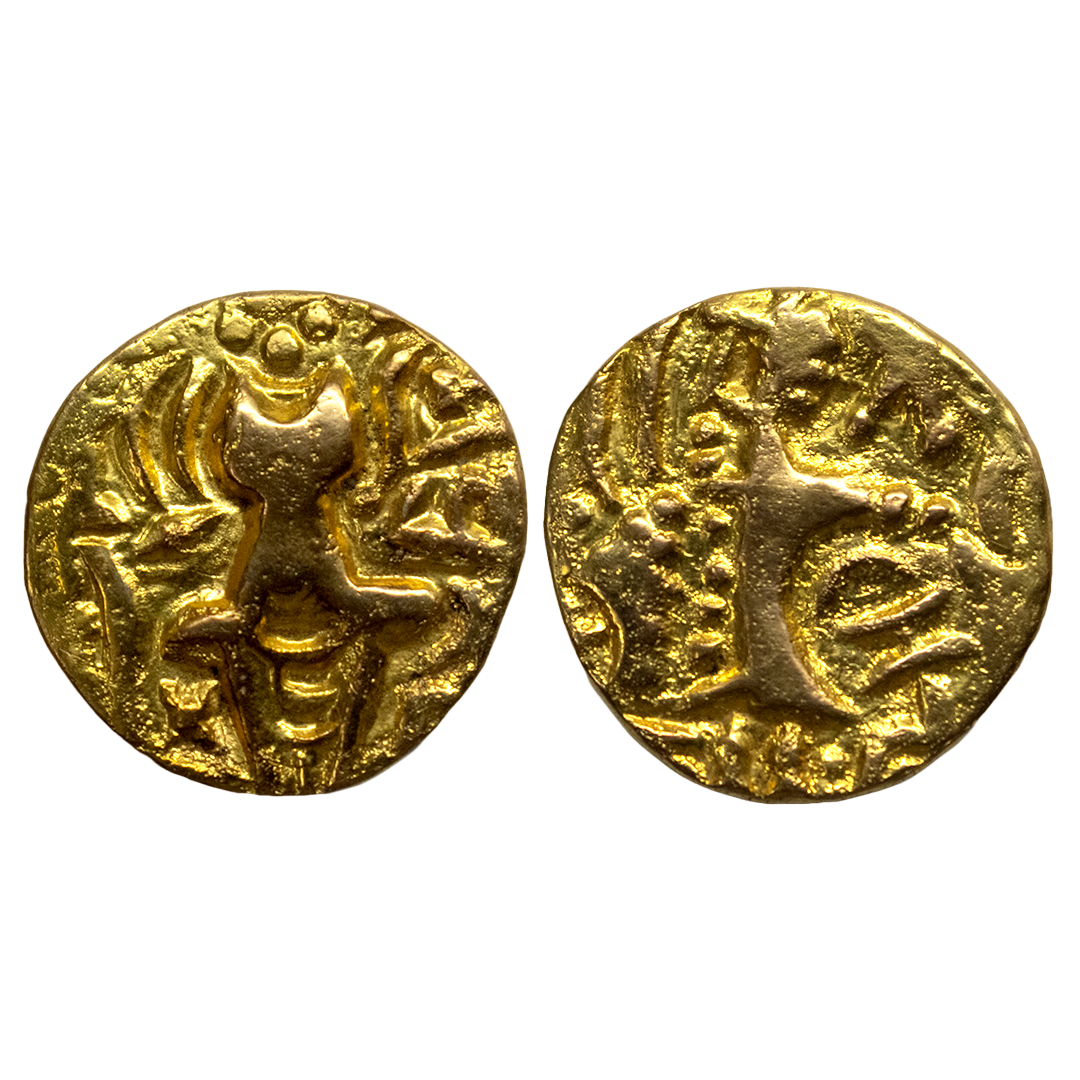 Ancient India, Kashmir Kidarite, in the name of Pratapaditya (500-600 AD), Base Gold Dinar, 6.91Grms, OBV: Crude representation of a Kushan-style king offering sacrifice, Brahmi legend Kira(da) under his arm. REV: Crude representation of goddess seated on throne; Brahmi legend Sri Pratapa in right field. (Mitch # ACW 3638-43).