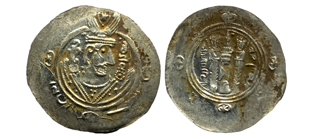 Ancient World, Arab-Sasanian. al-Muhallab b. Silver Drachm, 1.87grms, Abi Sufra. Circa AH 75-79 / AD 694-698, OBV: Crowned and diademed bust of king to right, Pahalvi legend, Dotted border around, Stars and Crescents outside dotted border, REV: Zoroastrian Fire Altar at center, flanked by attendants on either side. (SICA 1, 203; Album 31). Extremely Fine.