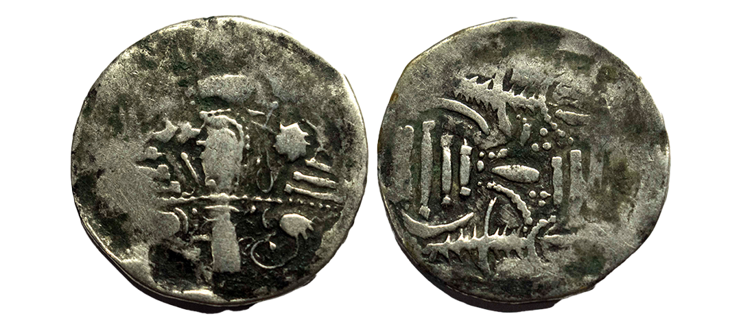 Ancient World, Arab-Sasanian. al-Muhallab b. Silver Drachm, 1.87grms, Abi Sufra. Circa AH 75-79 / AD 694-698, OBV: Crowned and diademed bust of king to right, Pahalvi legend, Dotted border around, Stars and Crescents outside dotted border, REV: Zoroastrian Fire Altar at center, flanked by attendants on either side. (SICA 1, 203; Album 31). Extremely Fine.