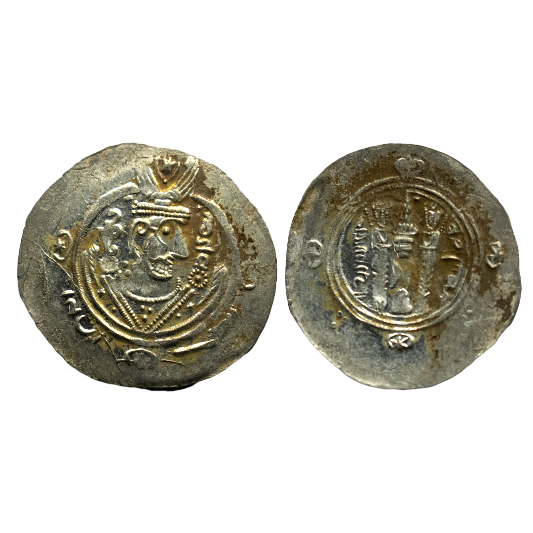 Ancient World, Arab-Sasanian. al-Muhallab b. Silver Drachm, 1.87grms, Abi Sufra. Circa AH 75-79 / AD 694-698, OBV: Crowned and diademed bust of king to right, Pahalvi legend, Dotted border around, Stars and Crescents outside dotted border, REV: Zoroastrian Fire Altar at center, flanked by attendants on either side. (SICA 1, 203; Album 31). Extremely Fine.