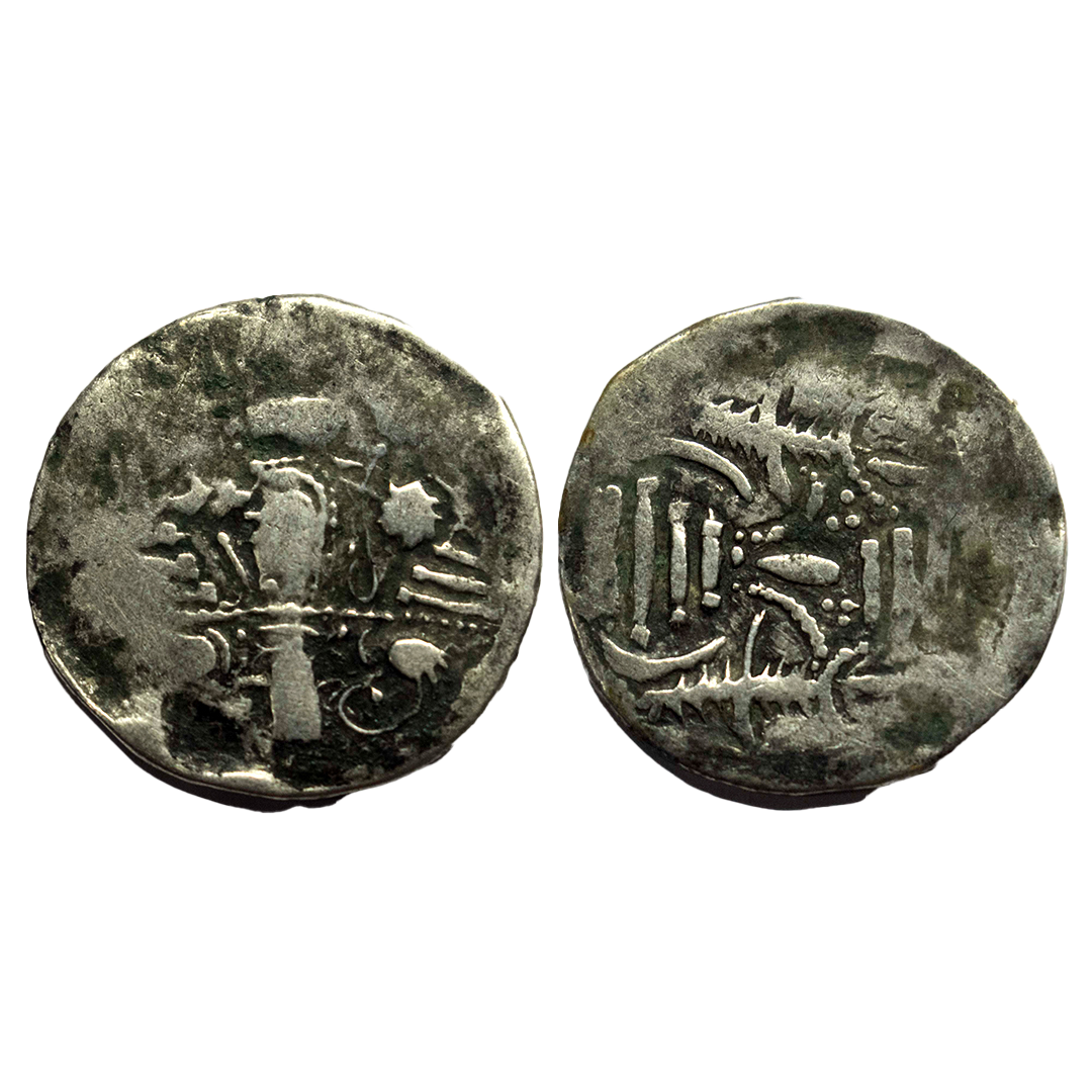 Ancient World, Arab-Sasanian. al-Muhallab b. Silver Drachm, 1.87grms, Abi Sufra. Circa AH 75-79 / AD 694-698, OBV: Crowned and diademed bust of king to right, Pahalvi legend, Dotted border around, Stars and Crescents outside dotted border, REV: Zoroastrian Fire Altar at center, flanked by attendants on either side. (SICA 1, 203; Album 31). Extremely Fine.