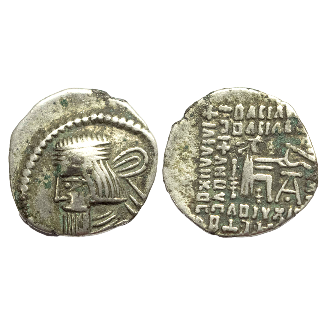 Ancient World, Arab-Sasanian. al-Muhallab b. Silver Drachm, 1.87grms, Abi Sufra. Circa AH 75-79 / AD 694-698, OBV: Crowned and diademed bust of king to right, Pahalvi legend, Dotted border around, Stars and Crescents outside dotted border, REV: Zoroastrian Fire Altar at center, flanked by attendants on either side. (SICA 1, 203; Album 31). Extremely Fine.