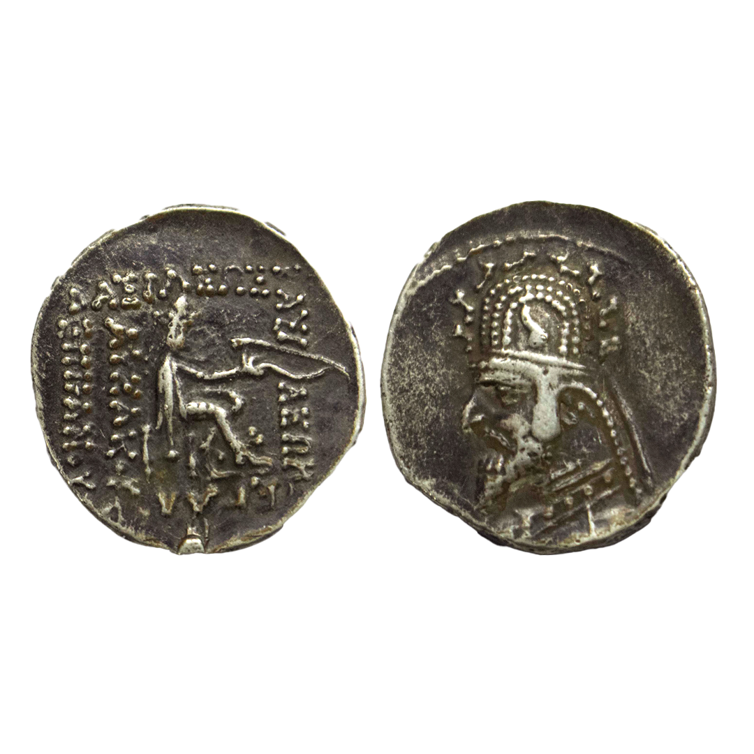 Ancient World, Arab-Sasanian. al-Muhallab b. Silver Drachm, 1.87grms, Abi Sufra. Circa AH 75-79 / AD 694-698, OBV: Crowned and diademed bust of king to right, Pahalvi legend, Dotted border around, Stars and Crescents outside dotted border, REV: Zoroastrian Fire Altar at center, flanked by attendants on either side. (SICA 1, 203; Album 31). Extremely Fine.