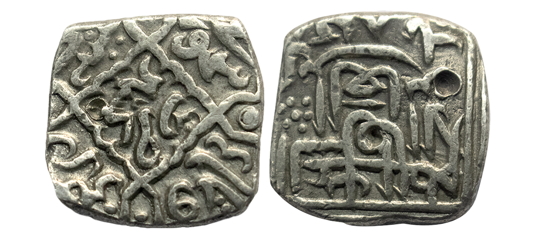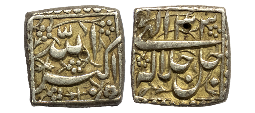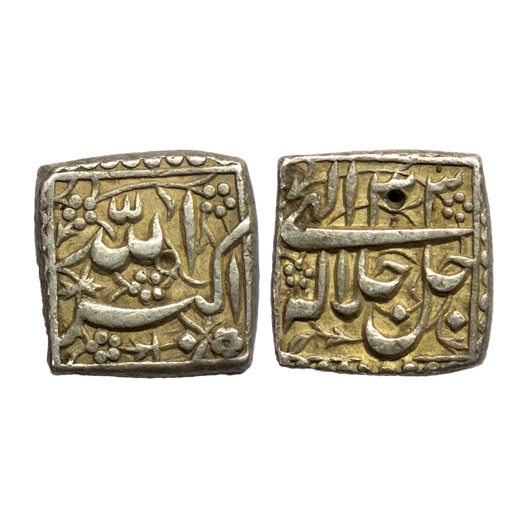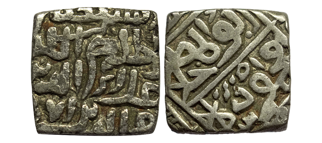 Mughal, Akbar (1556-1605 AD), silver square rupee, Bang mint, , KM A86.1, 11.20g. Obv: Kalima within square. Rev: Persian legend Jalal ud-din Muhammad Akbar Badshah; Good very fine, Rare
