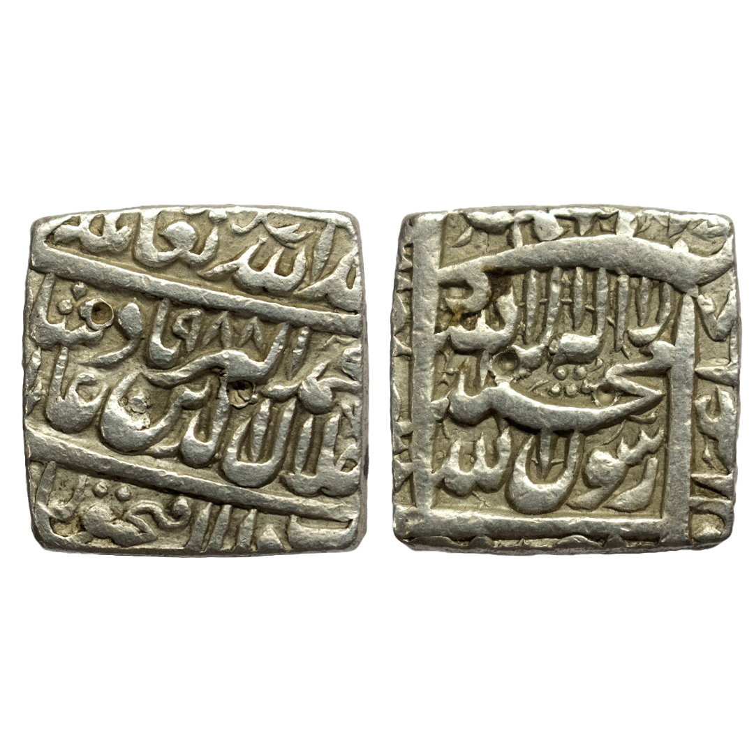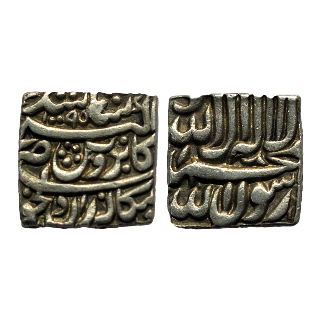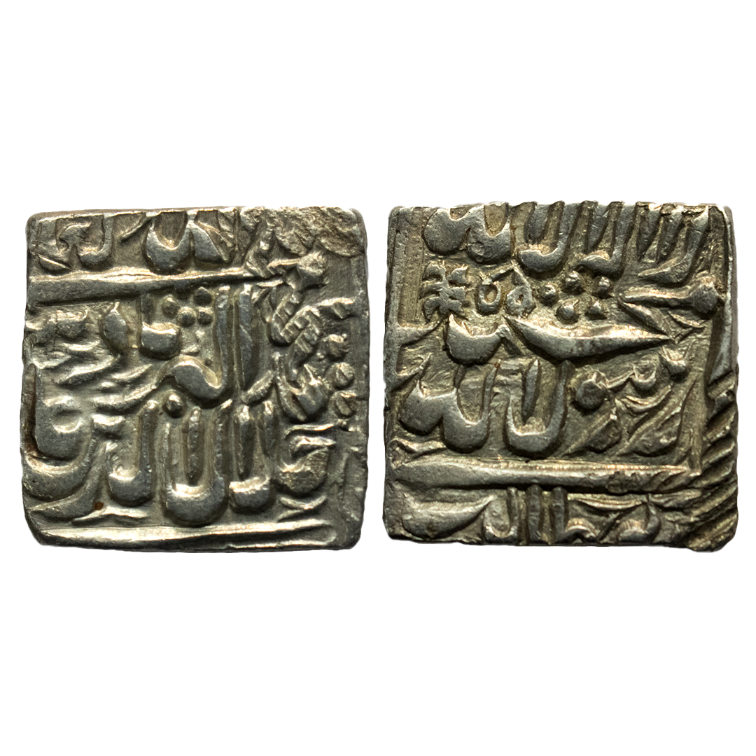 Mughal, Akbar Akbar (1556-1605 AD), silver square rupee, Bangala mint, 'Kaabe Roshan' couplet, AH 1009, KM 86.1,. Obv: Kalima. Rev: 'Kaabe Roshan' couplet with AH date. About Uncirculated, Rare.