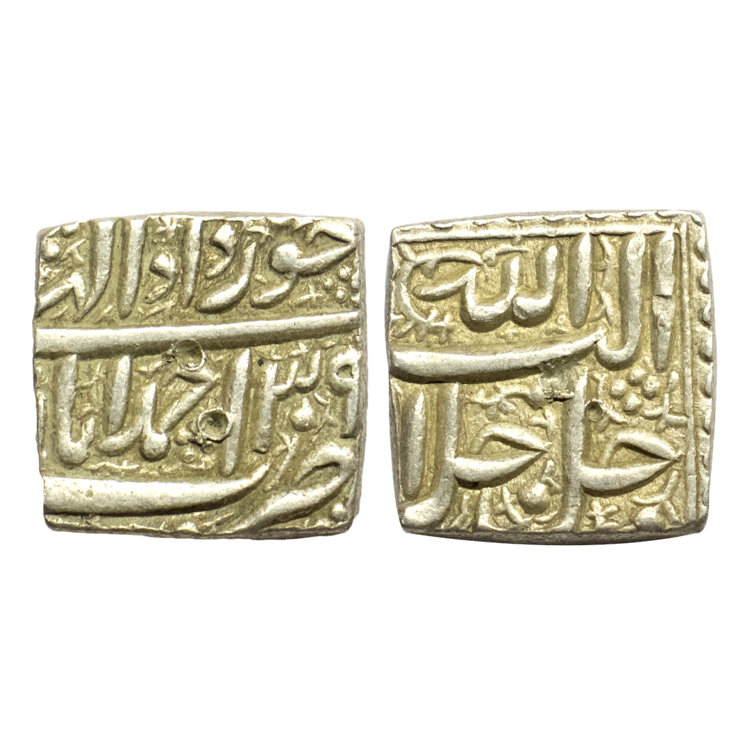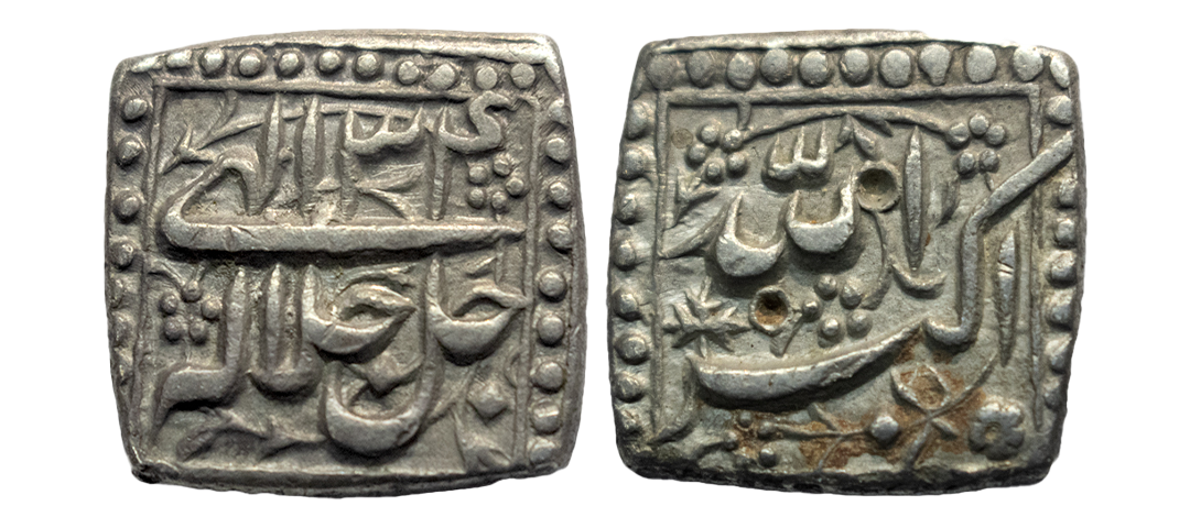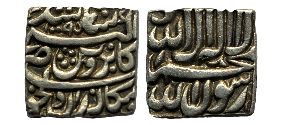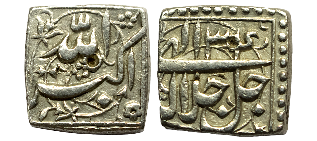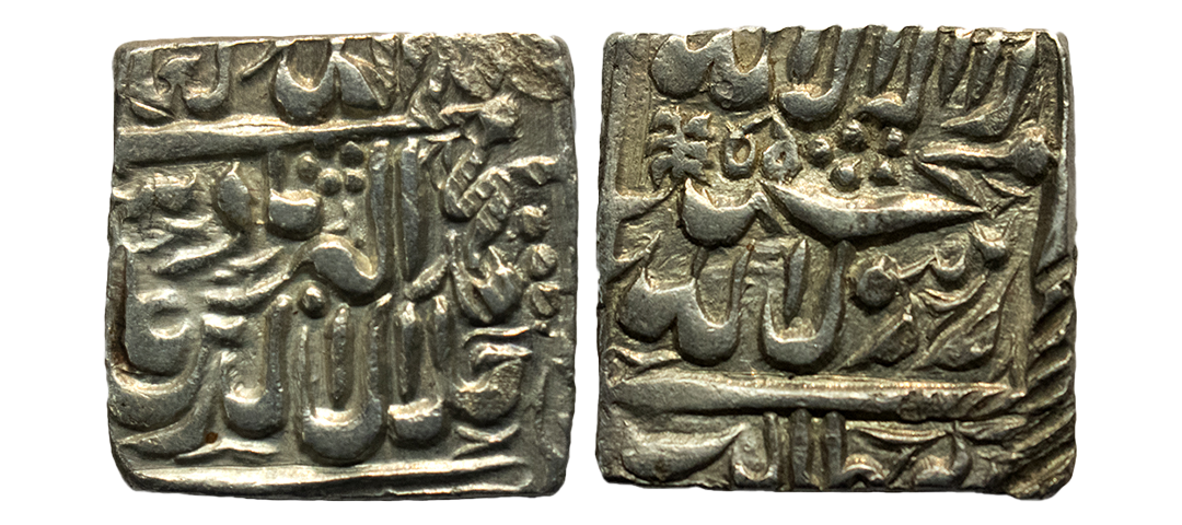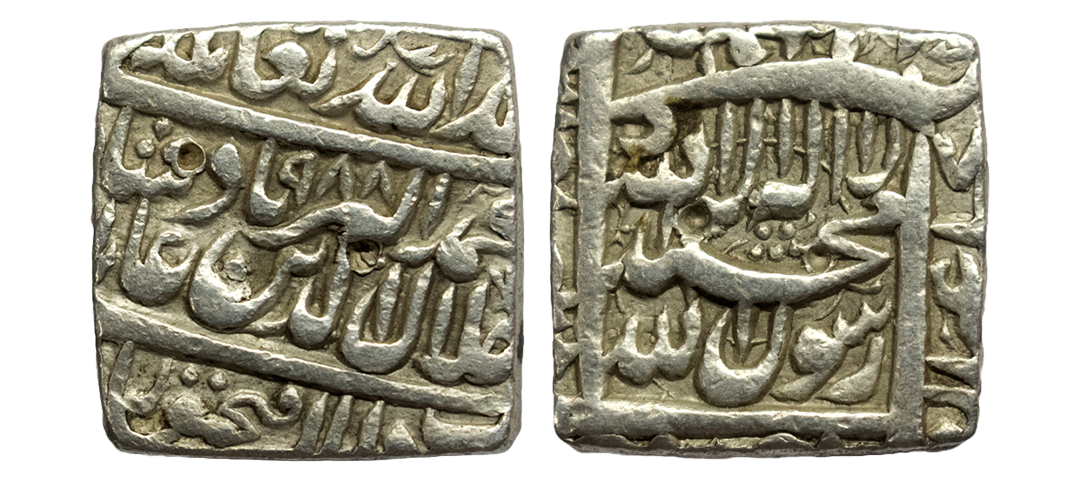 Mughal, Akbar Akbar (1556-1605 AD), silver square rupee, Bangala mint, 'Kaabe Roshan' couplet, AH 1009, KM 86.1,. Obv: Kalima. Rev: 'Kaabe Roshan' couplet with AH date. About Uncirculated, Rare.