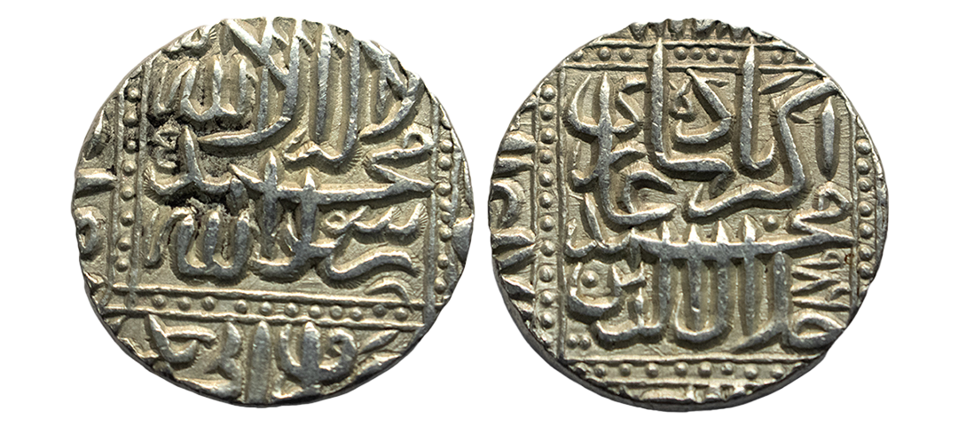 Mughal, Akbar (AH 963-1014, 1556-1605 AD), Silver Rupee, 11.39 gms, Ahmedabad Mint, Ilahi Month Mihir, Year 47, ornamental border on both sides, KM # 94.2, very fine+, very rare in this flan size and central strike.