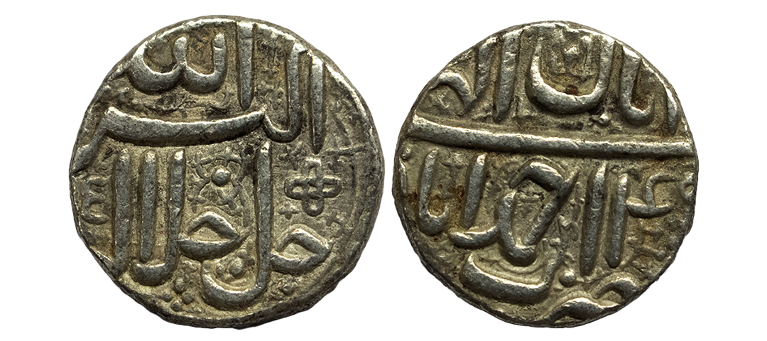 Mughal, Akbar (AH 963-1014, 1556-1605 AD), Silver Rupee, 11.39 gms, Ahmedabad Mint, Ilahi Month Mihir, Year 47, ornamental border on both sides, KM # 94.2, very fine+, very rare in this flan size and central strike.