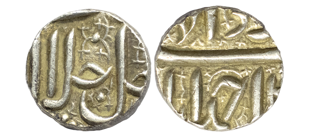 Mughal, Akbar (AH 963-1014, 1556-1605 AD), Silver Rupee, 11.39 gms, Ahmedabad Mint, Ilahi Month Mihir, Year 47, ornamental border on both sides, KM # 94.2, very fine+, very rare in this flan size and central strike.