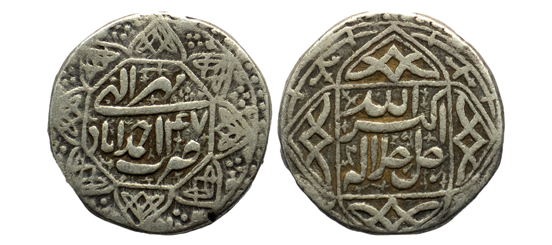 Mughal, Akbar (AH 963-1014, 1556-1605 AD), Silver Rupee, 11.39 gms, Ahmedabad Mint, Ilahi Month Mihir, Year 47, ornamental border on both sides, KM # 94.2, very fine+, very rare in this flan size and central strike.