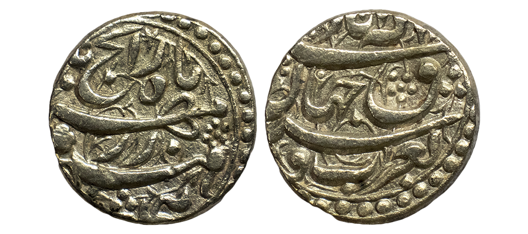 Mughal, Akbar (AH 963-1014, 1556-1605 AD), Silver Rupee, 11.39 gms, Ahmedabad Mint, Ilahi Month Mihir, Year 47, ornamental border on both sides, KM # 94.2, very fine+, very rare in this flan size and central strike.