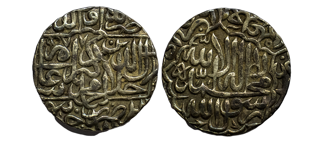 Mughal, Akbar (AH 963-1014, 1556-1605 AD), Silver Rupee, 11.39 gms, Ahmedabad Mint, Ilahi Month Mihir, Year 47, ornamental border on both sides, KM # 94.2, very fine+, very rare in this flan size and central strike.