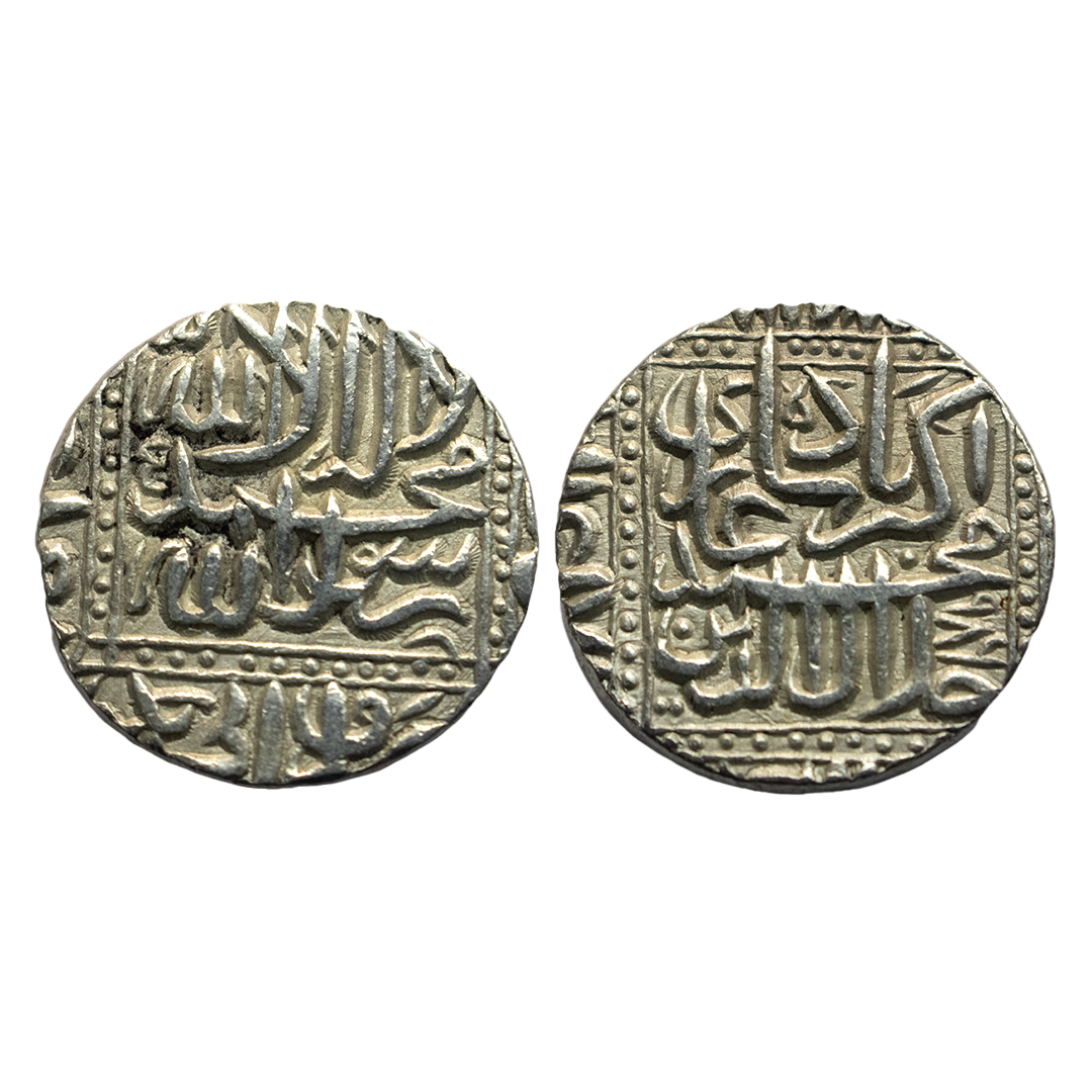 Mughal, Akbar (AH 963-1014, 1556-1605 AD), Silver Rupee, 11.39 gms, Ahmedabad Mint, Ilahi Month Mihir, Year 47, ornamental border on both sides, KM # 94.2, very fine+, very rare in this flan size and central strike.