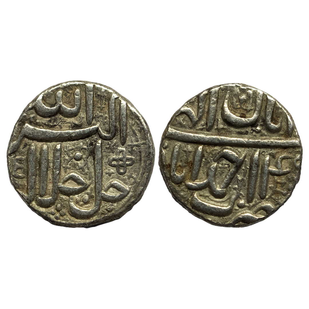 Mughal, Akbar (AH 963-1014, 1556-1605 AD), Silver Rupee, 11.39 gms, Ahmedabad Mint, Ilahi Month Mihir, Year 47, ornamental border on both sides, KM # 94.2, very fine+, very rare in this flan size and central strike.