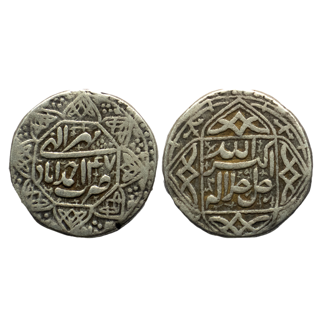 Mughal, Akbar (AH 963-1014, 1556-1605 AD), Silver Rupee, 11.39 gms, Ahmedabad Mint, Ilahi Month Mihir, Year 47, ornamental border on both sides, KM # 94.2, very fine+, very rare in this flan size and central strike.