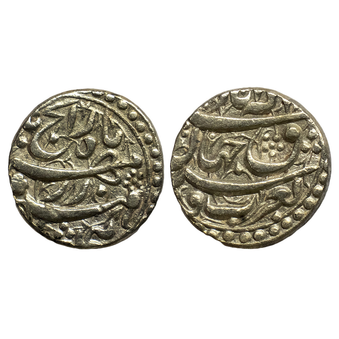Mughal, Akbar (AH 963-1014, 1556-1605 AD), Silver Rupee, 11.39 gms, Ahmedabad Mint, Ilahi Month Mihir, Year 47, ornamental border on both sides, KM # 94.2, very fine+, very rare in this flan size and central strike.