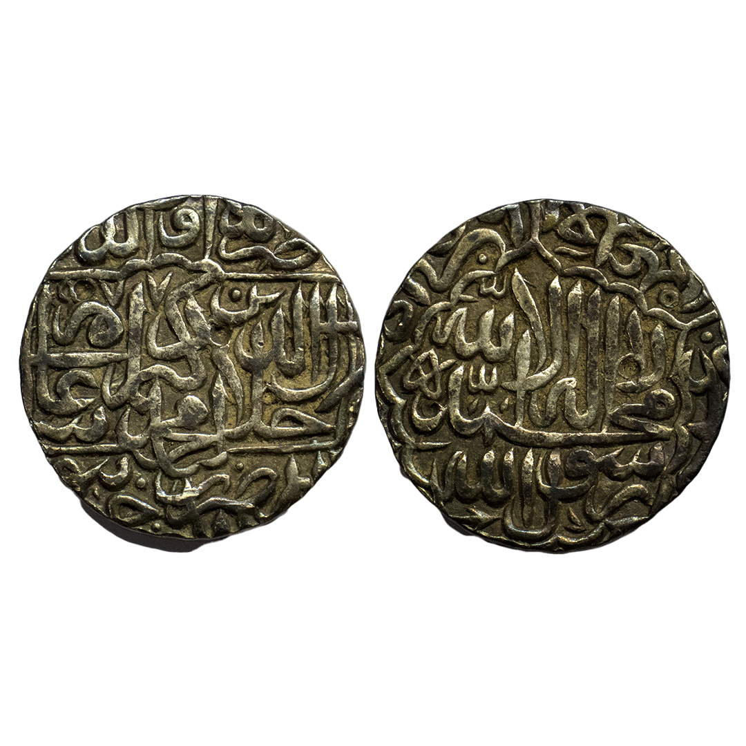 Mughal, Akbar (AH 963-1014, 1556-1605 AD), Silver Rupee, 11.39 gms, Ahmedabad Mint, Ilahi Month Mihir, Year 47, ornamental border on both sides, KM # 94.2, very fine+, very rare in this flan size and central strike.