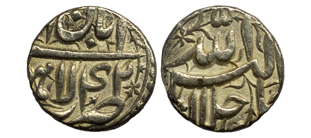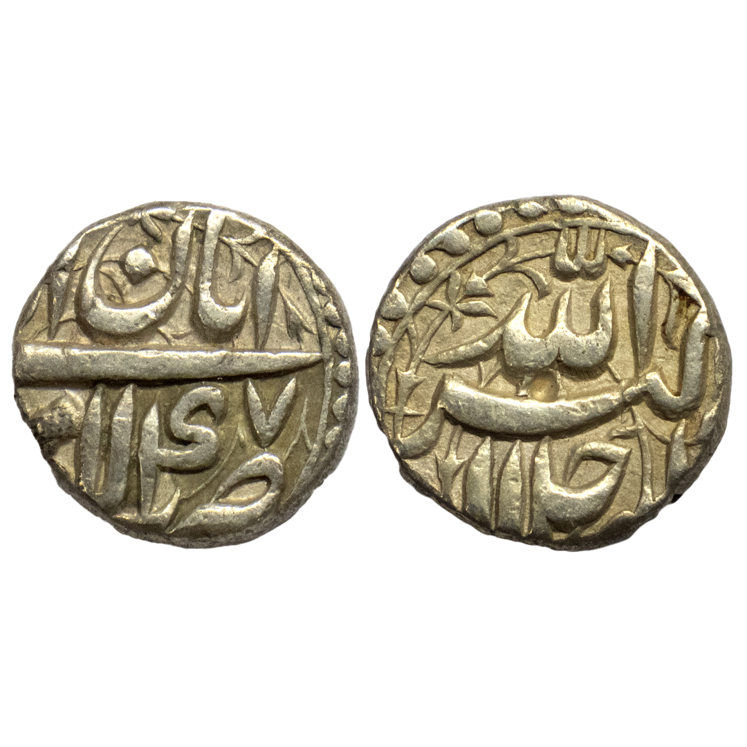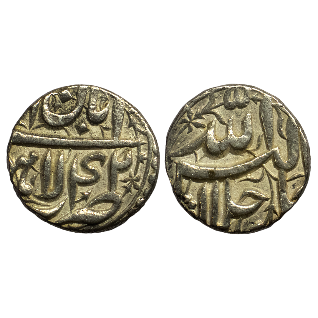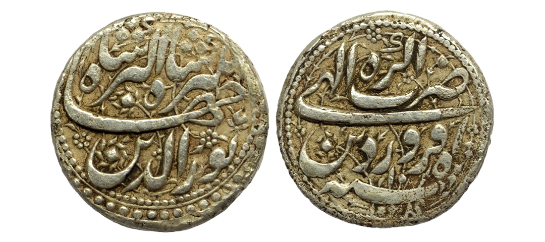 Mughals, Jahangir (AH 1014-1037 /1605-1627 AD), Agra Mint (Mint at top), Silver Rupee, AH 1024 /10 RY, Month Farwardin, Obv: Persian legend “Noor ud din Jahangir Shah Akbar Shah”, Rev: Persian legend “ zarb Agra” at the top, “Elahi mah Farwardin” &“sana 1023 Hijri” with regnal year 9 at the bottom, 11.7g, (Unlisted in KM), no test marks, very attractive, floral motifs and scroll design with dotted borders, Very Fine, Very Rare.Note: This coin displays the mint name 'Agra' prominently at the top, an unusual placement as it typically appears at the bottom. This variety is unlisted in the KM catalog