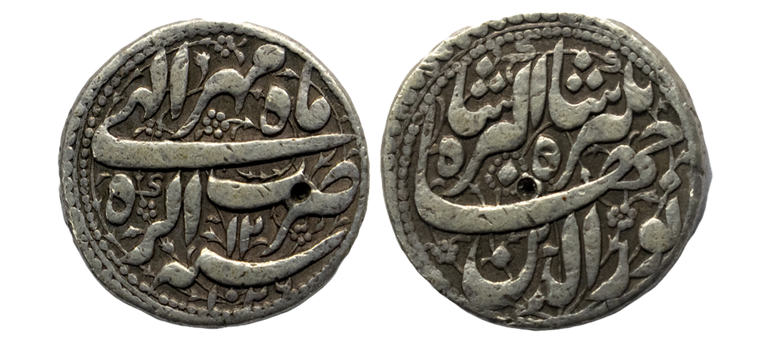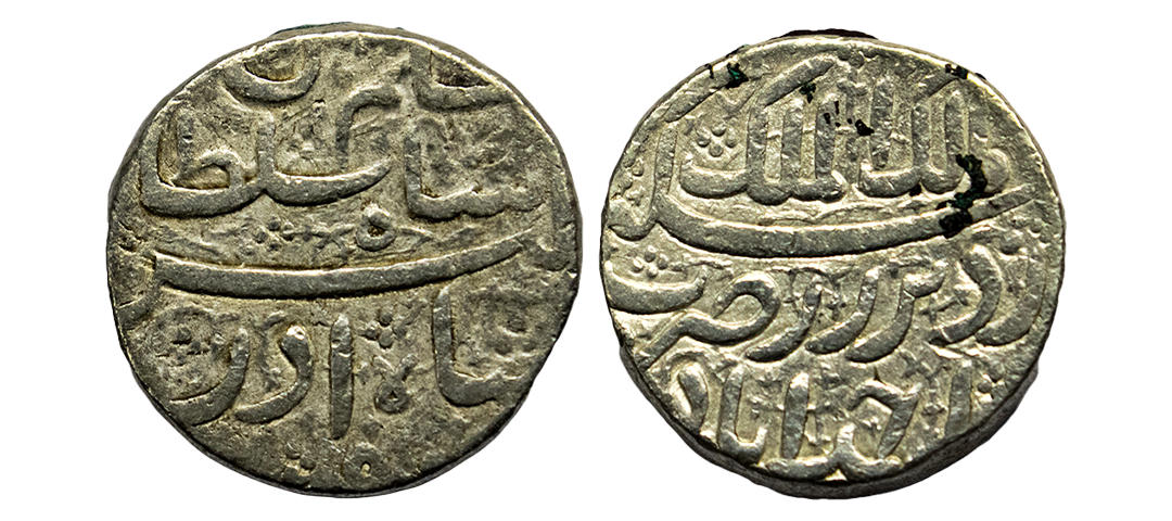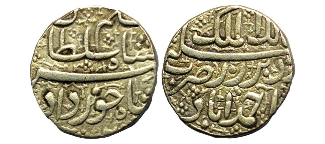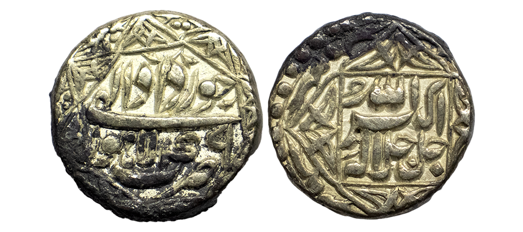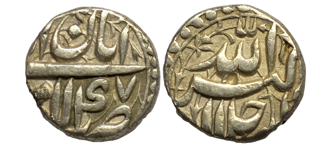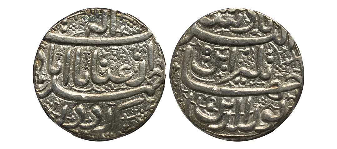 Mughals, Jahangir (AH 1014-1037 /1605-1627 AD), Agra Mint (Mint at top), Silver Rupee, AH 1024 /10 RY, Month Farwardin, Obv: Persian legend “Noor ud din Jahangir Shah Akbar Shah”, Rev: Persian legend “ zarb Agra” at the top, “Elahi mah Farwardin” &“sana 1023 Hijri” with regnal year 9 at the bottom, 11.7g, (Unlisted in KM), no test marks, very attractive, floral motifs and scroll design with dotted borders, Very Fine, Very Rare.Note: This coin displays the mint name 'Agra' prominently at the top, an unusual placement as it typically appears at the bottom. This variety is unlisted in the KM catalog