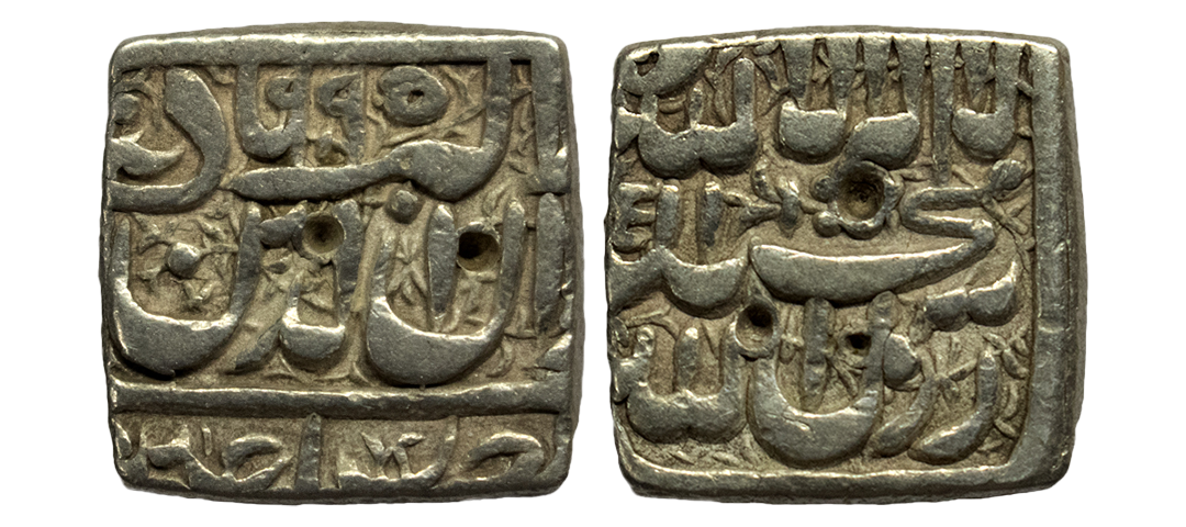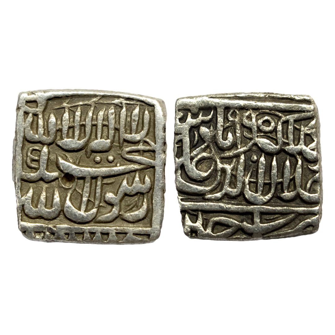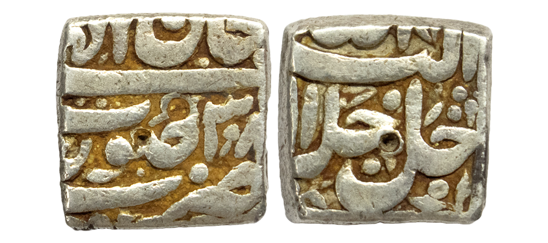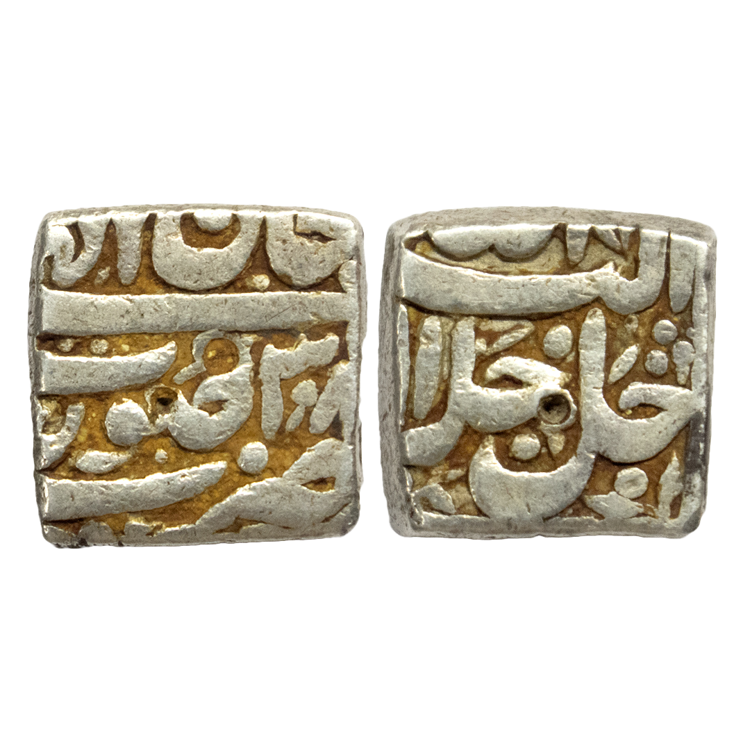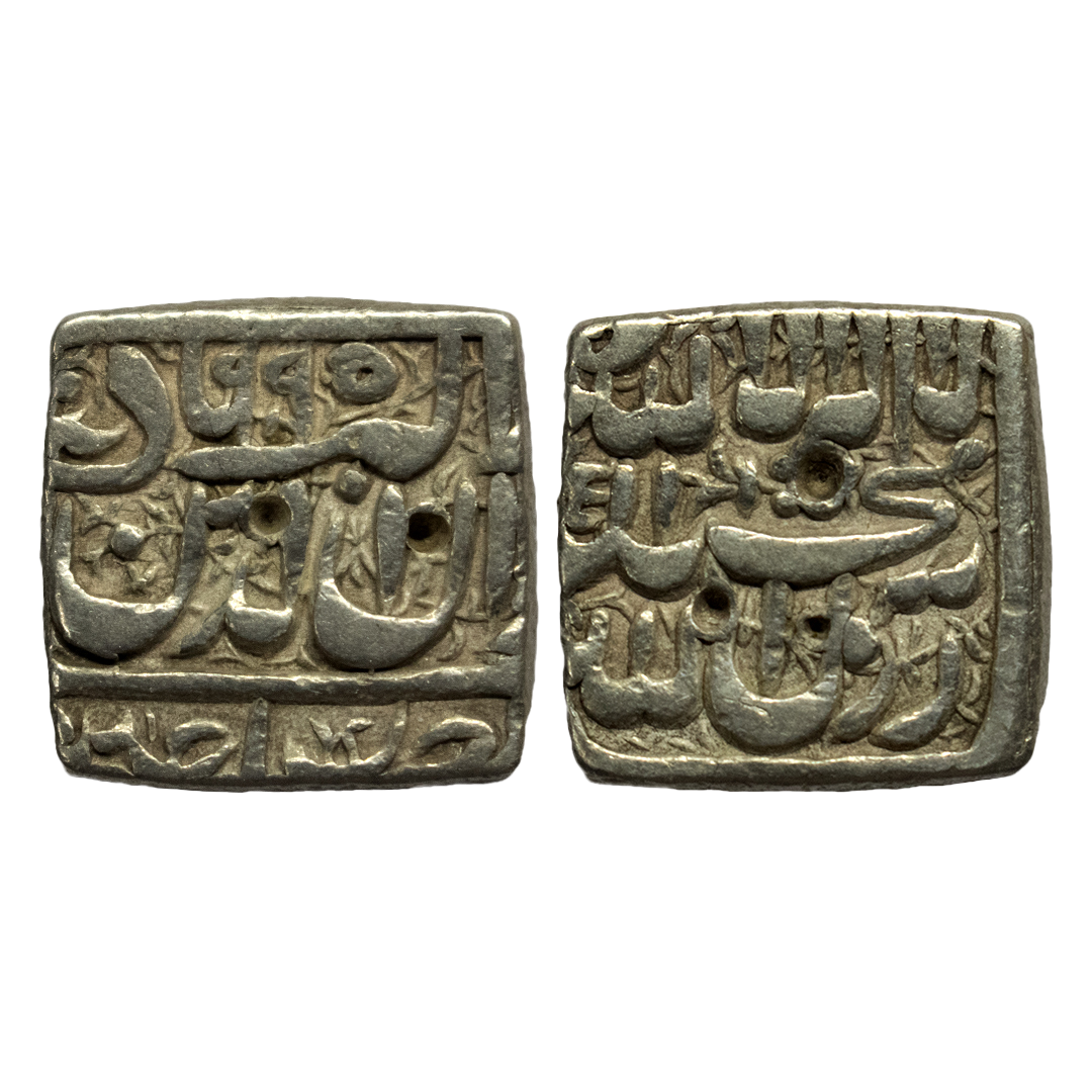 Mughal Akbar (1556-1605 AD), silver square rupee, Surat mint, letter 'swaad' instead of letter 'seen' in Surat, Aban, Ilahi 38, KM 88.6, 9.77 gram. Good Very fine, Very rare.