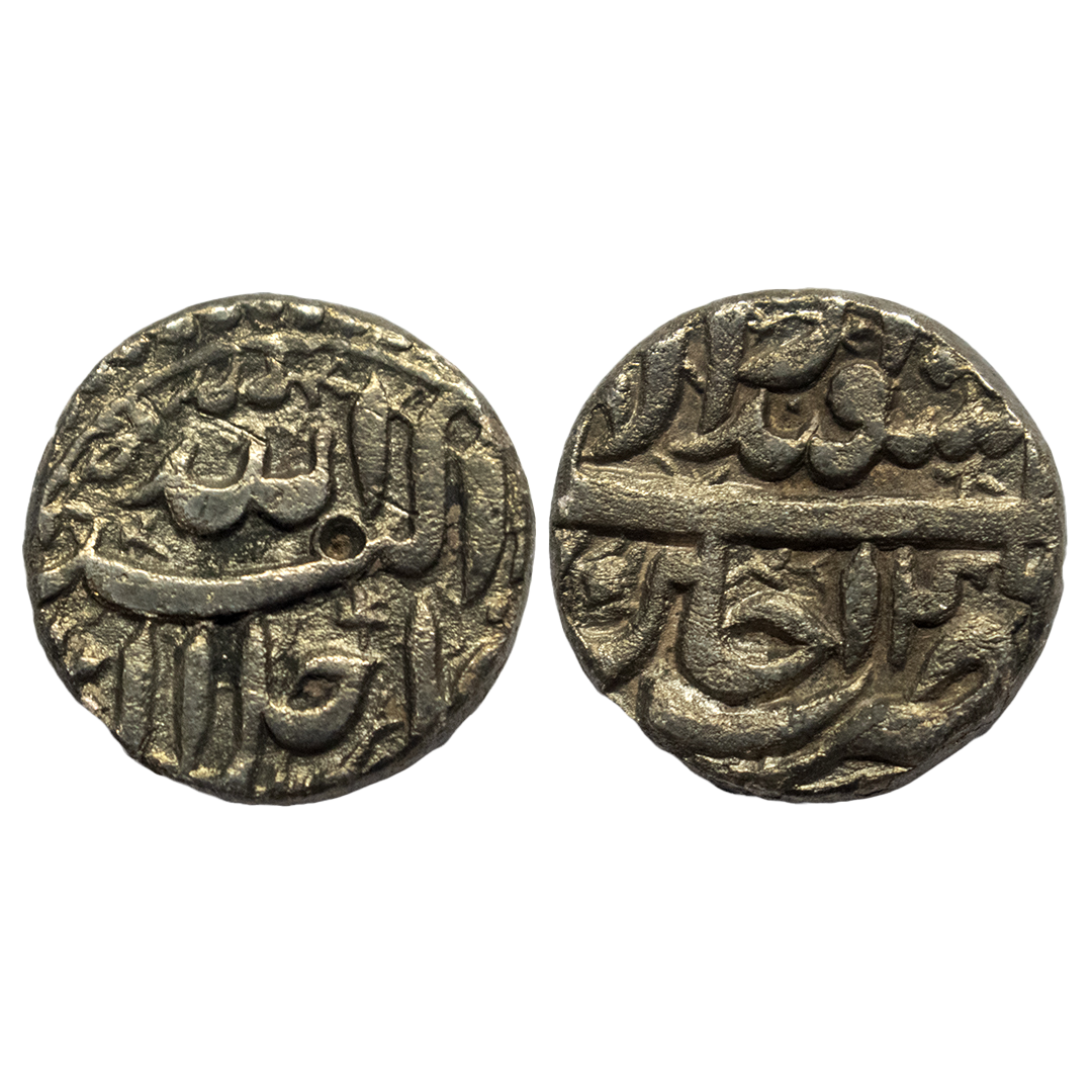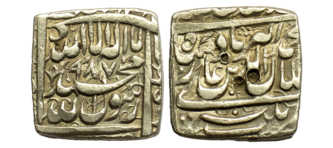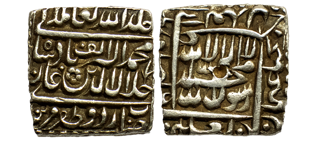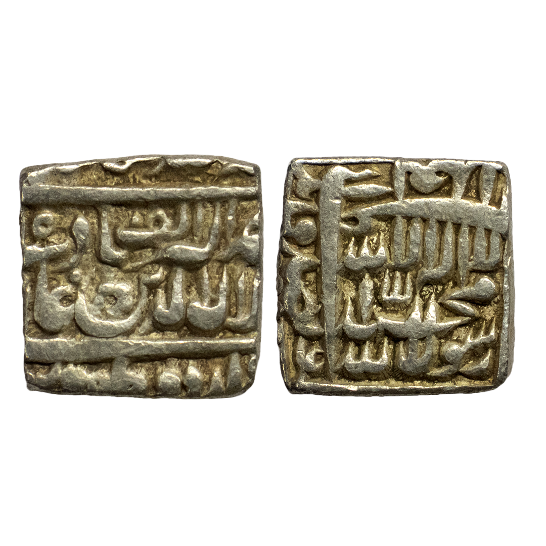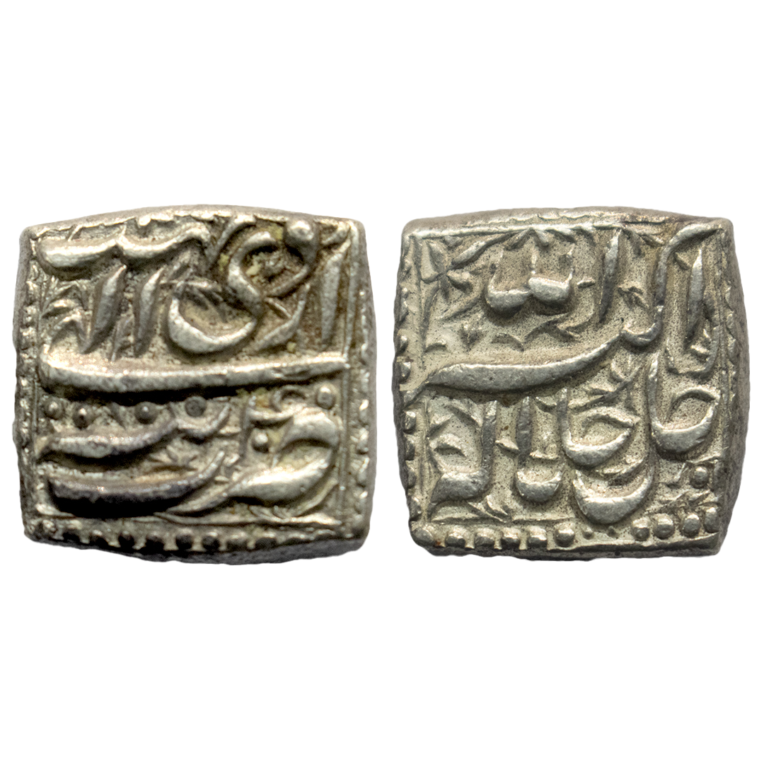 Mughal Akbar (1556-1605 AD), silver square rupee, Surat mint, letter 'swaad' instead of letter 'seen' in Surat, Aban, Ilahi 38, KM 88.6, 9.77 gram. Good Very fine, Very rare.