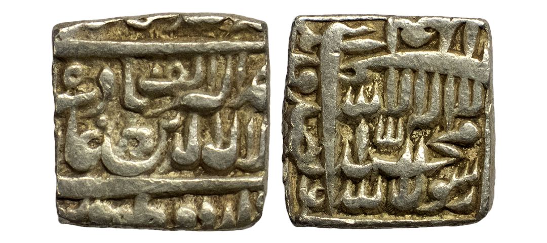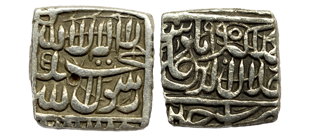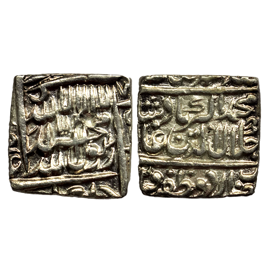 Mughal, Akbar (1556-1605 AD) Silver Square Rupee, 11.21g, Patna Mint, 987 AH, KM 82.6, Very Fine+, Extremely Rare. Complete Mint Visible, Square Rupees of Patna Mint are Rare for Akbar’s coinage.