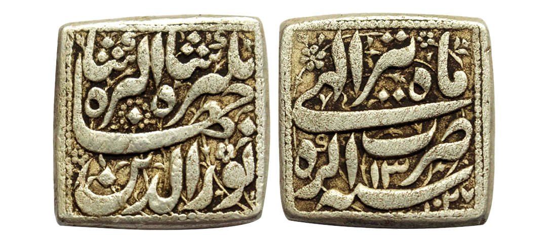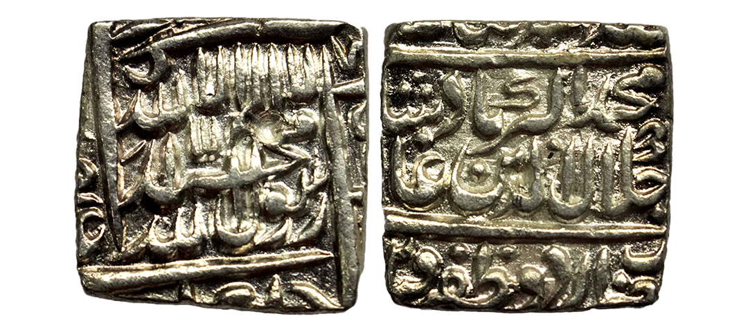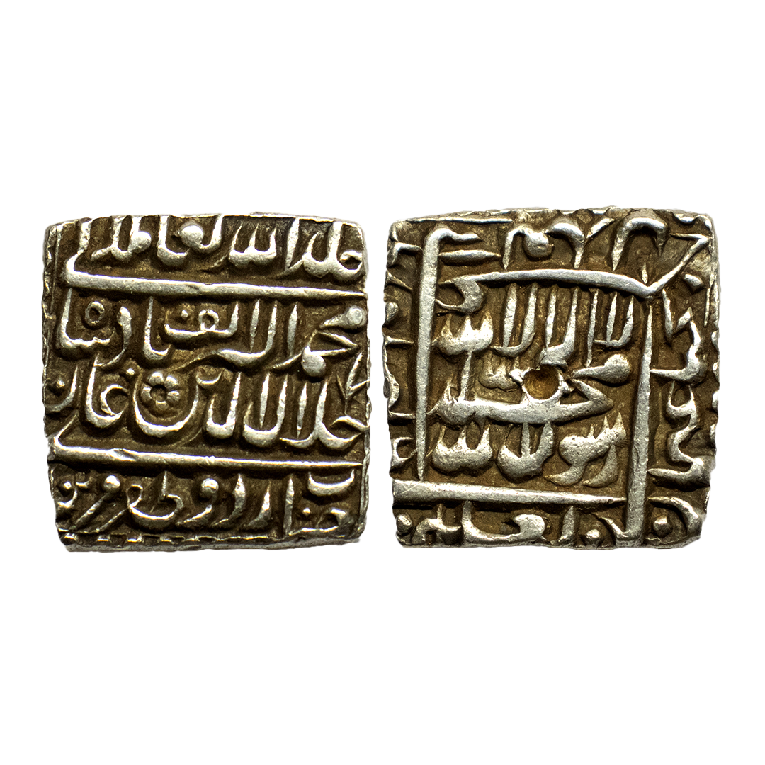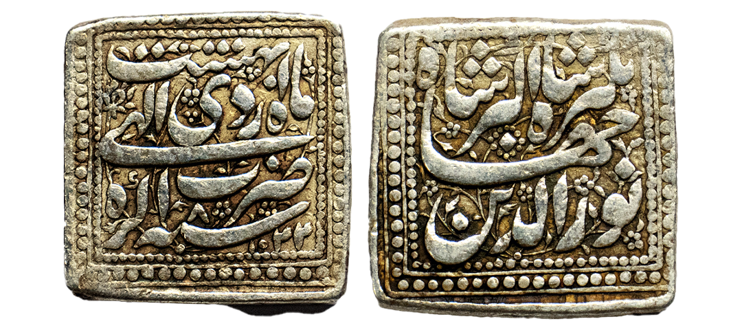 Mughal, Jahangir, Silver Square Rupee, Bang Mint, 1015AH, Plate Coin of CMCI Vol. 2 by NG&DR GR# 6.30. In Reverse Between Kalima ‘Allah-u-Akbar’ written in the Tughra calligraphic style. Coins from Bang Mint are known for Akbar and Jahangir, under Jahangir’s reign mint Bang was active for very few initial years, making the coin extremely rare, obv: kalima, rev: Nur ud din muhammad jahangir badshah ghazi 1015, Unlisted in KM, No Test Marks, About Extremely Fine, Extremely Rare.