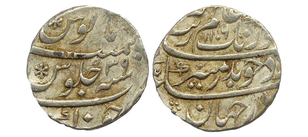 Mughals, Auragzeb (AH 1068-1118 / 1658-1707 AD), Silver Rupee, 11.540Grms, Ahmadabad Mint, AH 1118, RY 51, Last Ruling Year for Aurangzeb, Badr-i-munir type. (KM # 300.2). Very Fine+.