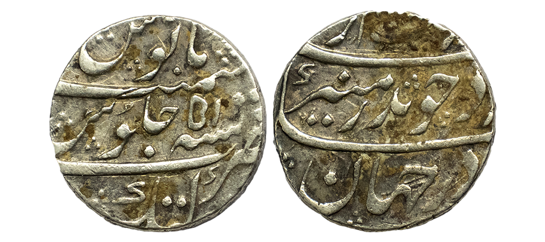 Mughals, Auragzeb (AH 1068-1118 / 1658-1707 AD), Silver Rupee, 11.540Grms, Ahmadabad Mint, AH 1118, RY 51, Last Ruling Year for Aurangzeb, Badr-i-munir type. (KM # 300.2). Very Fine+.