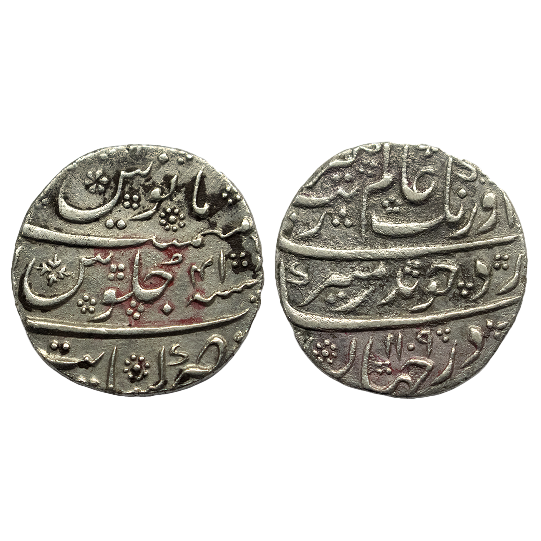 Mughals, Auragzeb (AH 1068-1118 / 1658-1707 AD), Silver Rupee, 11.540Grms, Ahmadabad Mint, AH 1118, RY 51, Last Ruling Year for Aurangzeb, Badr-i-munir type. (KM # 300.2). Very Fine+.